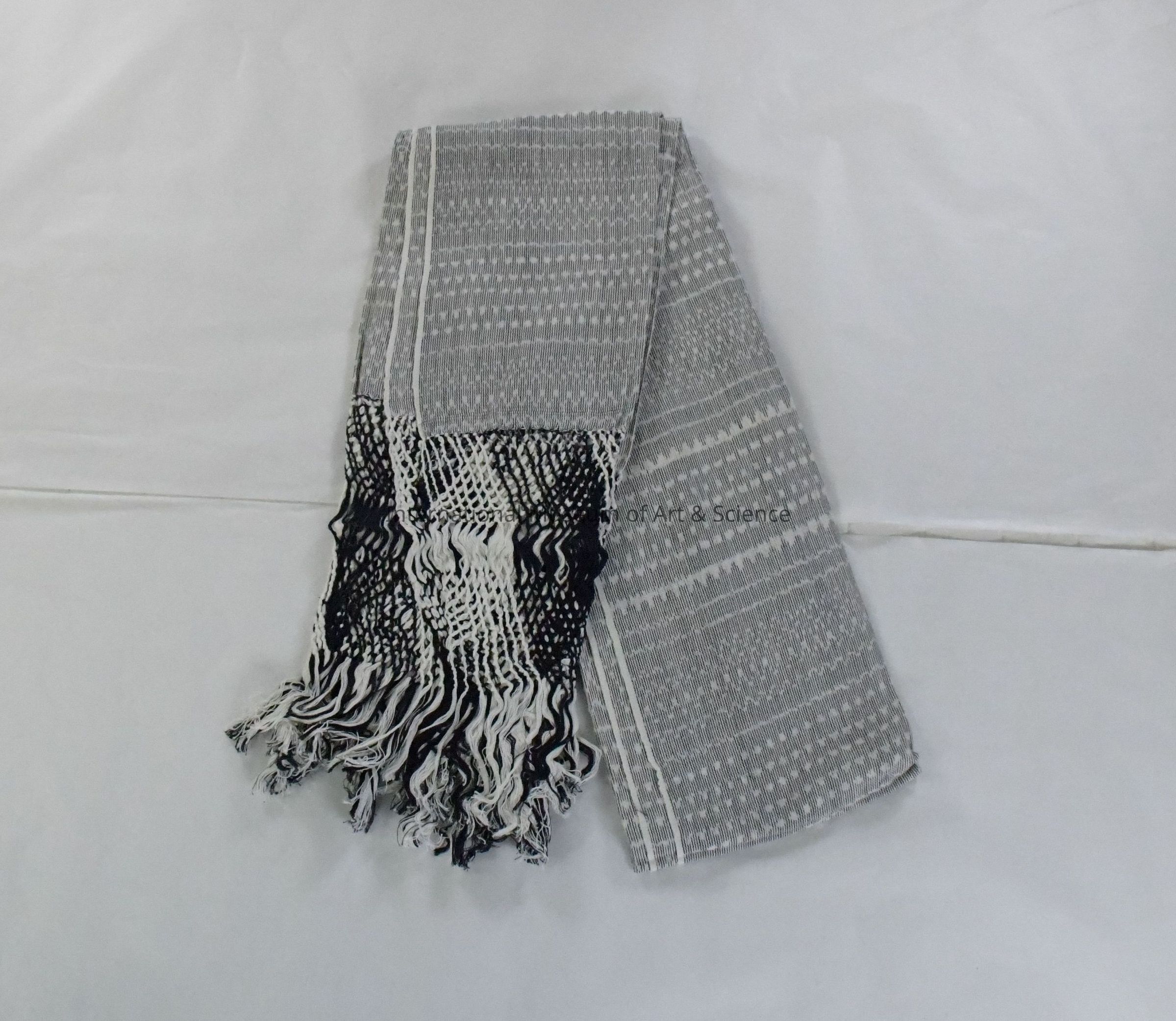 This rebozo is an elegant example of a contemporary mestizo shawl created in the town of Tenancingo, well known for its ikat-dyed textiles. It is woven from fine commercial cotton, dyed in a black and white ikat pattern that creates rhythmic sequences of blurred dots and lines across the length of the textile. The rebozo is finished at both ends with hand-knotted macramé fringe in black and white, showcasing diamond-like patterns in tightly knotted warp threads and loose hanging fringe. The edges are machine-hemmed, and the width of the piece reflects the standard limitation of the backstrap loom on which it was woven.Ethnography