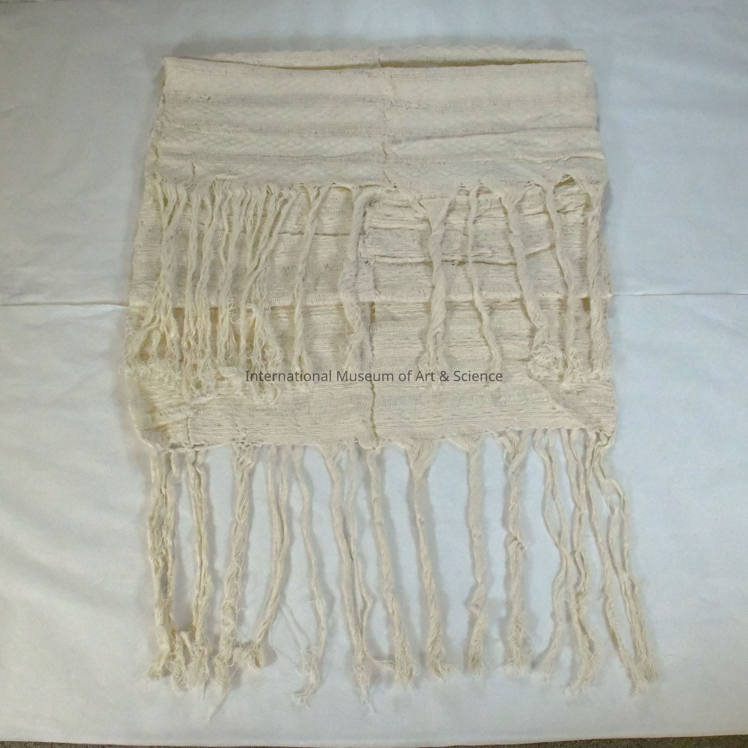 Undyed cotton panel composed of alternating bands of plain weave, gauze weave, and weft-float patterns, creating a varied tactile surface. The textile is woven on a human-operated upright loom, evident in its irregular textures and artisan finish. The ends are finished with long, twisted fringe that extends from the warp threads. The weave includes transparent gauze-like sections as well as denser bands, offering both visual rhythm and structural variety.Ethnography