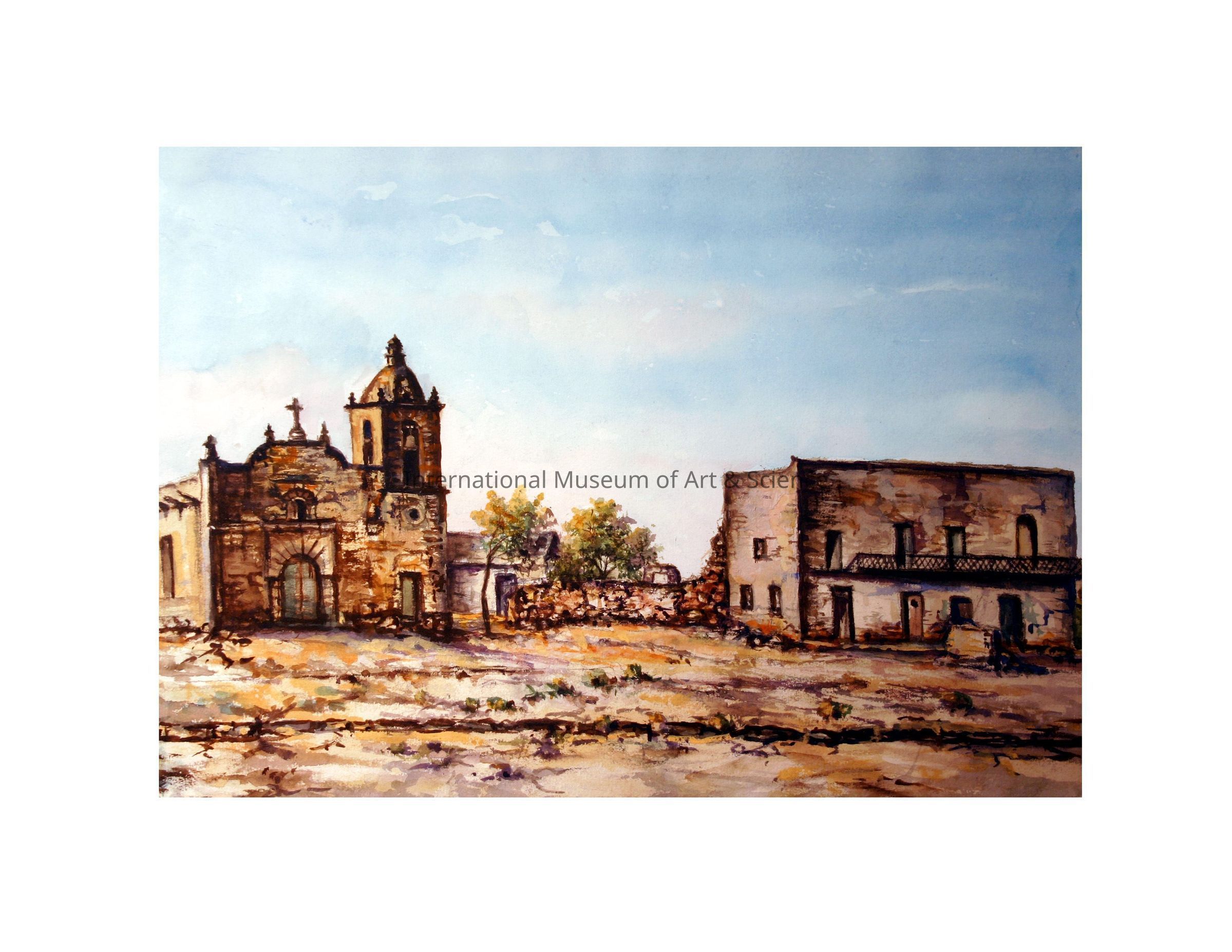 Mier. Church and building with balcony. Water color painting depicts adobe buildings; seperated, low brick wall between them; large church with church belfry, structure of church has arched door and window, flat, scalloped roof; crosses on top; church belfry attached with domed rooftop, large rectangular window opening exposing the church bell; adobe building on another side has flat rectangular structure form; balcony on second floor, three small windows on one side, eight rectangular door openings in teh front, green trees, smaller adobe buildings at a distance; light blue cloudy sky.Made/Created