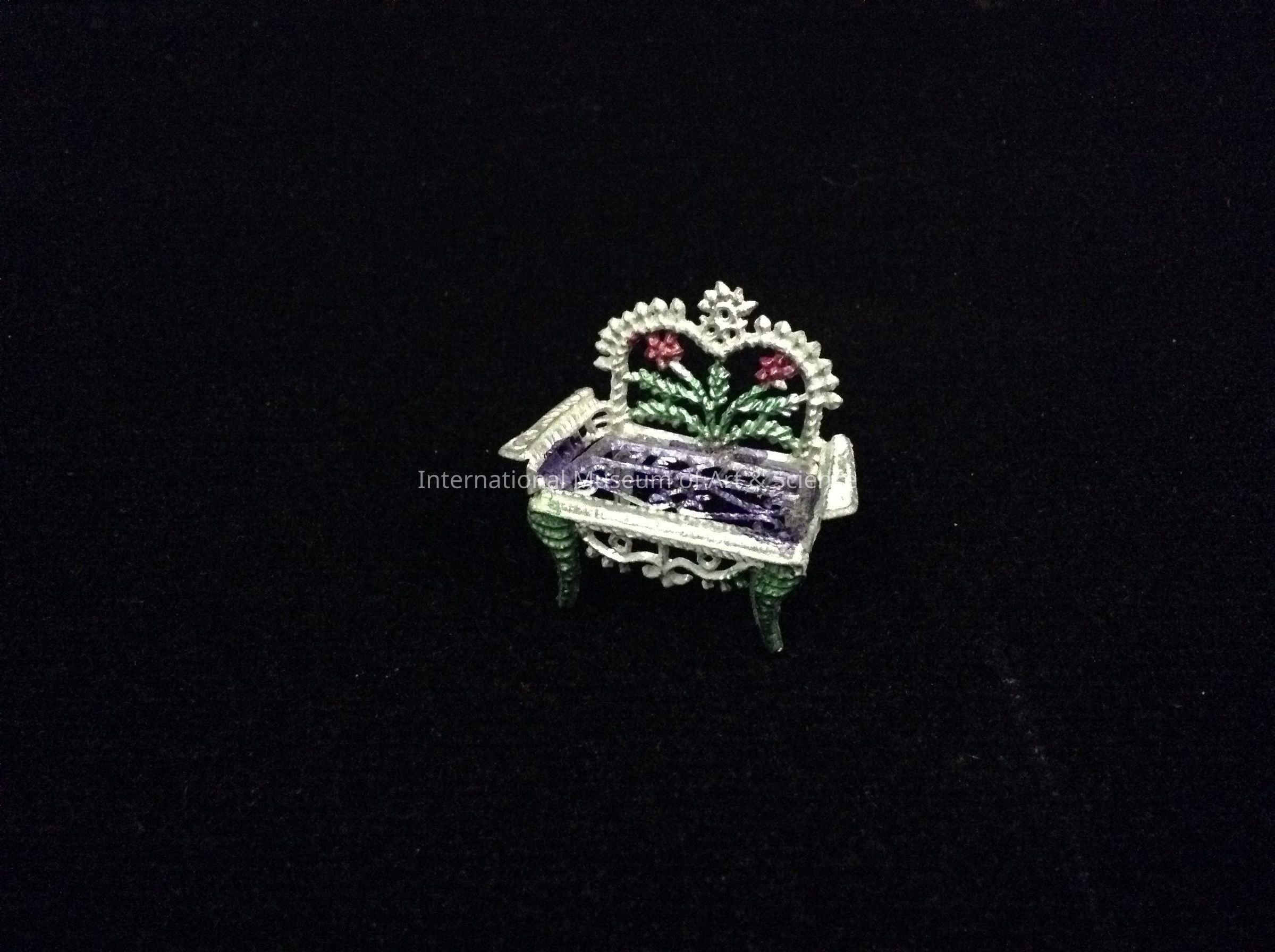 A miniature of a love seat. The love seat is made from a linotype metal (pot metal), cast in a mold. The love seat is cast as one piece. The figurine is decorated with paint. The love seat back, seat, and legs are painted in pink, purple, and green. "MEXICO" is on seat.Dimensions