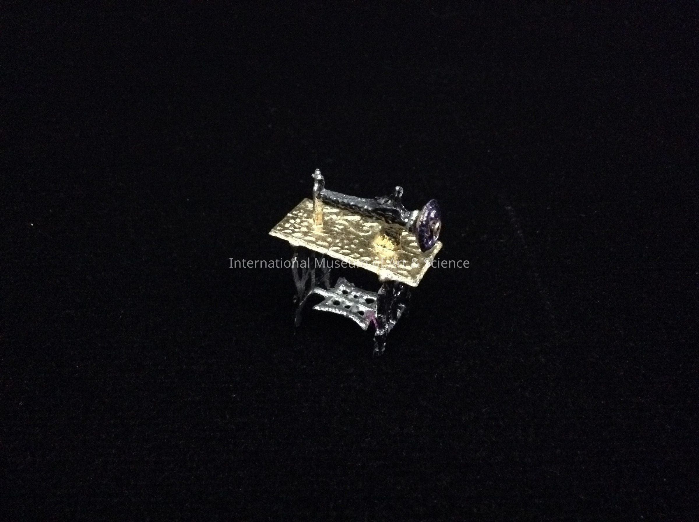 A miniature of a sewing machine. The sewing machine is made from a linotype metal (pot metal), cast in a mold. The machine is cast as one piece. The figurine is decorated with paint. It has a gold rectangular plate, a small round purple handle, and a black with gray stand.Dimensions