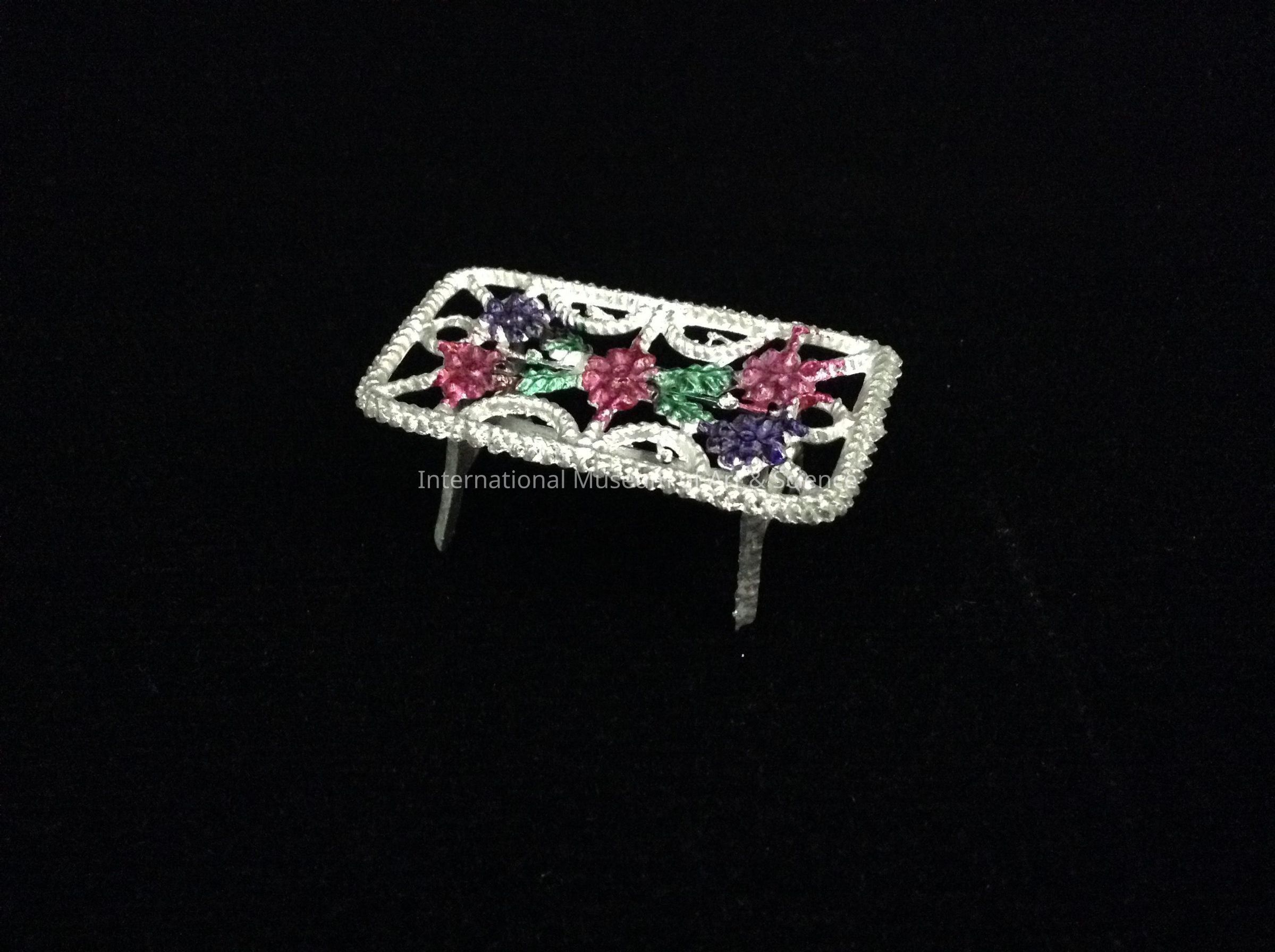 A miniature of a table. The table is made from a linotype metal (pot metal), cast in a mold. The table is cast as one piece. The figurine is decorated with paint. The table top is painted with pink and purple flowers and green leaves.Dimensions
