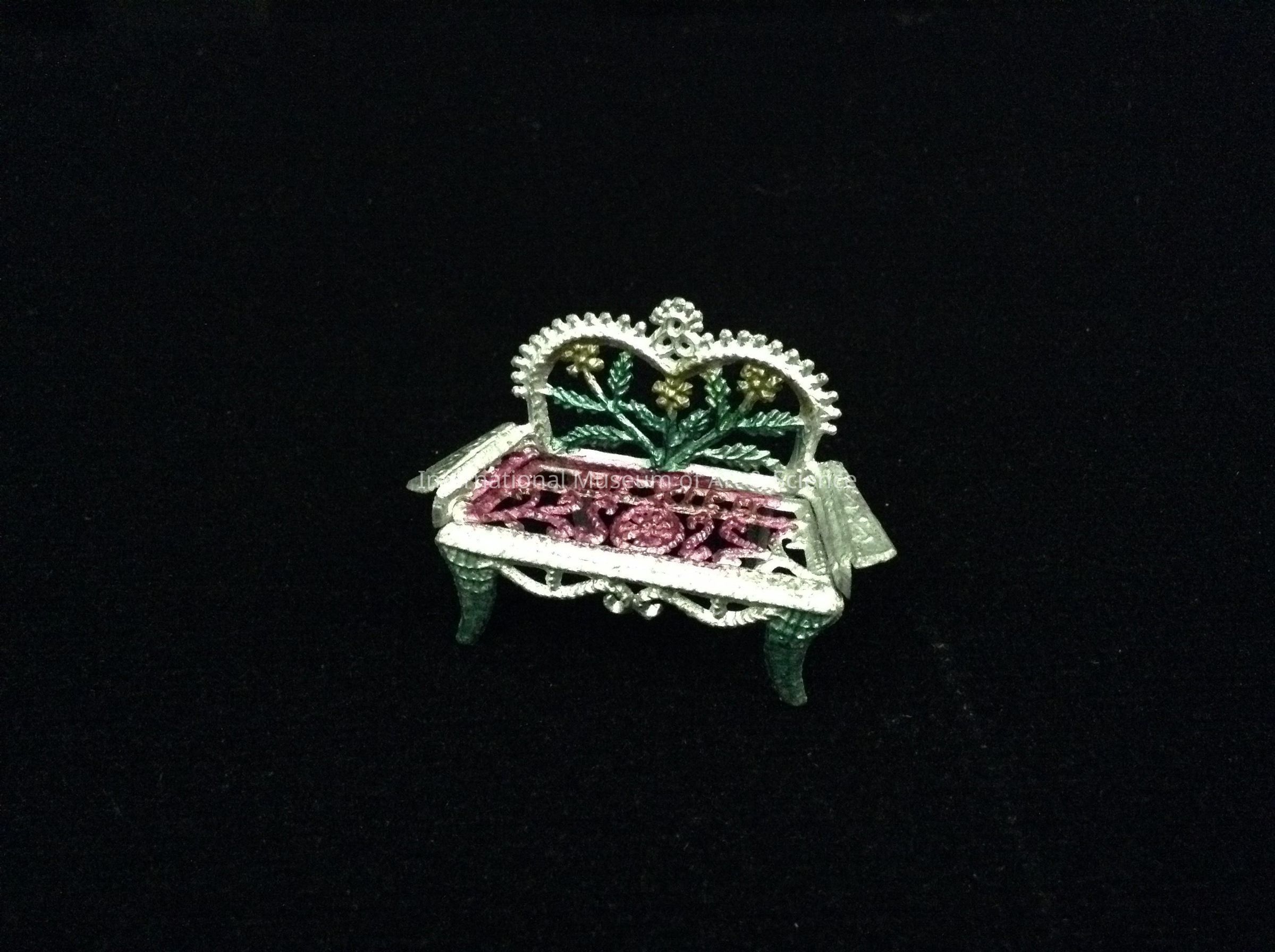 A miniature of a sofa. The sofa is made from a linotype metal (pot metal), cast in a mold. The sofa is cast as one piece. The figurine is decorated with paint. The scalloped back with yellow flowers and green leaves and the front legs in green. "MEXICO" is on seat.Dimensions