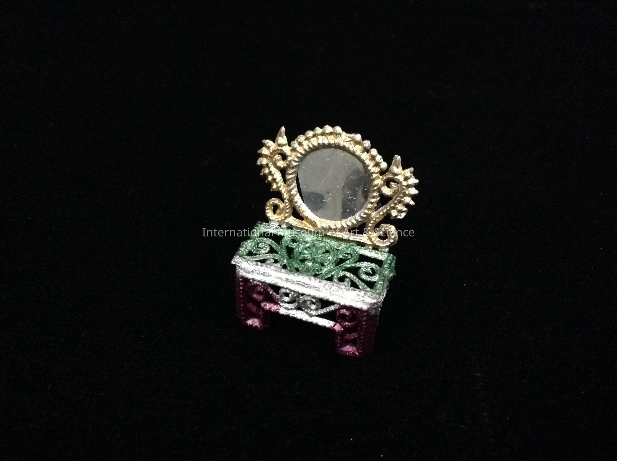 A miniature of a dresser with mirror. The dresser is made from a linotype metal (pot metal), cast in a mold. The dresser is cast as one piece and then the mirror added after. The figurine is decorated with paint. The scalloped back with yellow, the dresser top with green, and the front legs in pink.Artwork Details