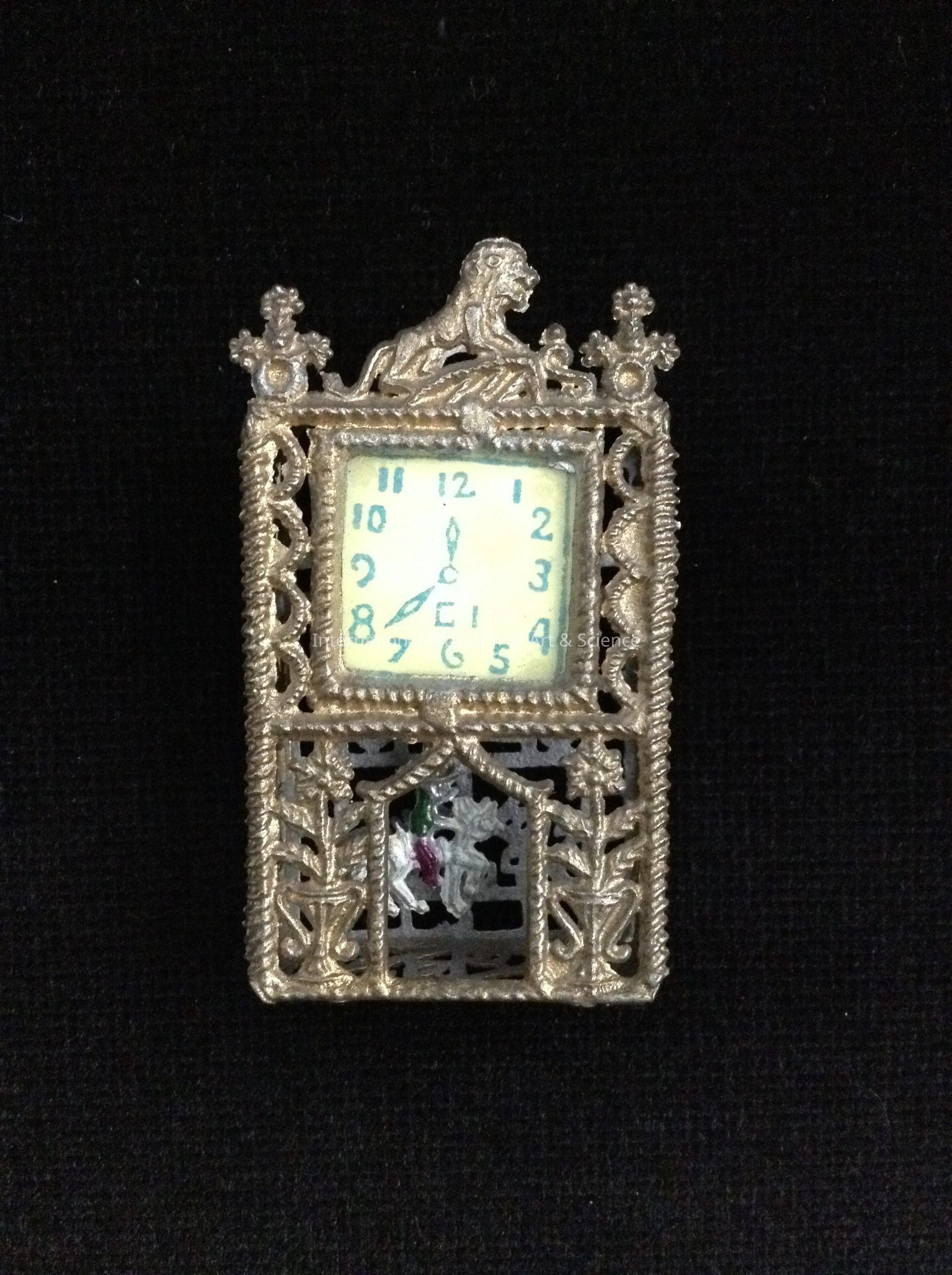 A miniature of a clock. The clock is made from a linotype metal (pot metal), cast in a mold. The clock is cast as two pieces, the clock body and the pendulum. The figurine is decorated with paint. It has a gold exterior, the back is grey. The pendulum shows a man on a horse in red, green, and white. On the back is HECHO EN MEXICO" - "SAN LUIS POTOSI".Artwork Details