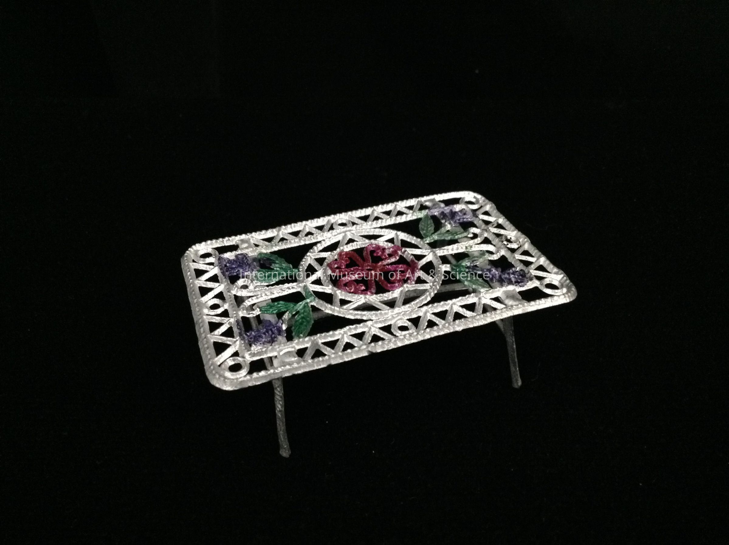A miniature of a table. The table is made from a linotype metal (pot metal), cast in a mold. The table is cast as one piece. The figurine is decorated with paint. The table top is painted with purple flowers, green leaves, and a maroon center design. "MEXICO" is stamped on the legs.Artwork Details