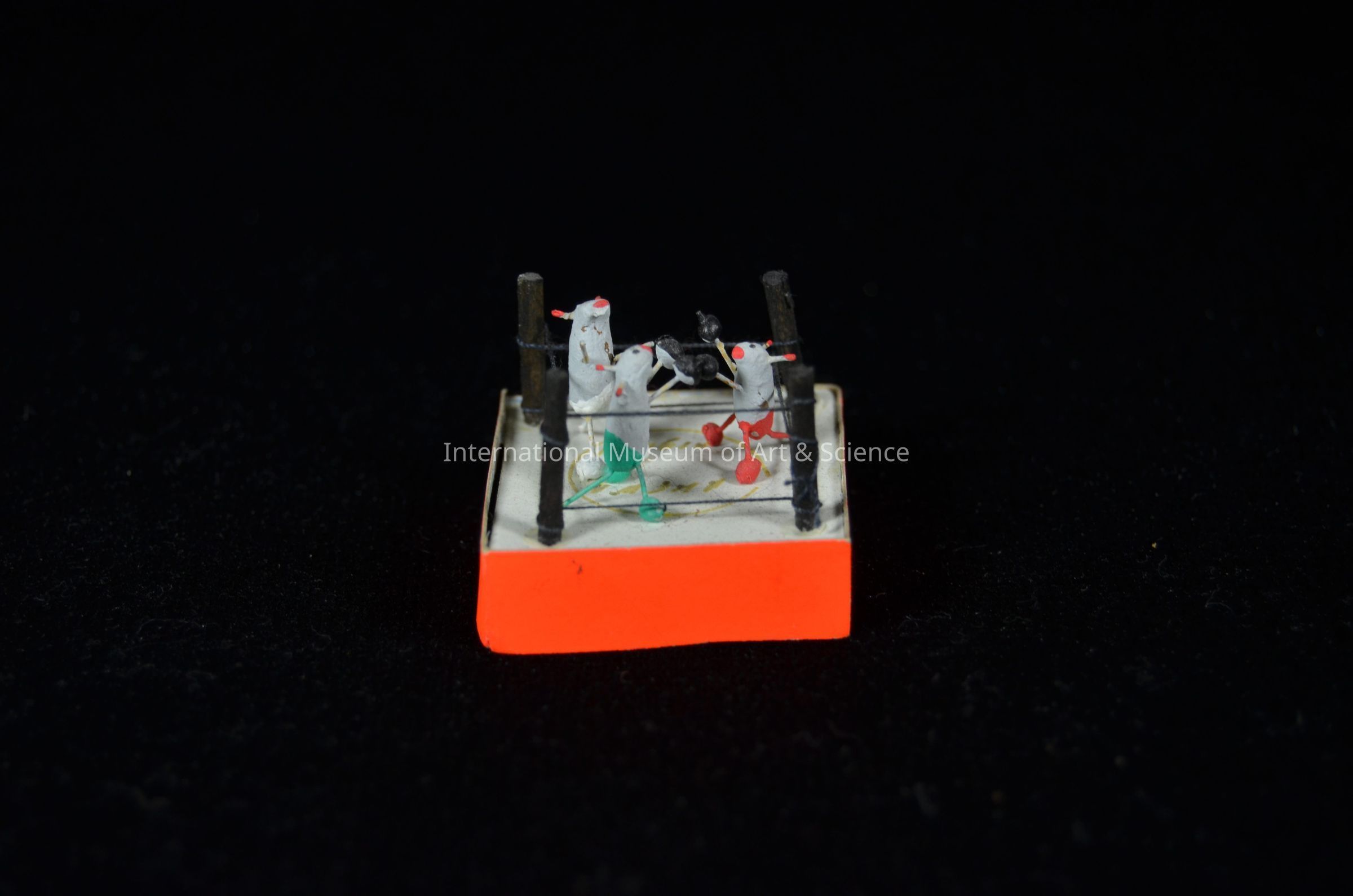 Miniature mice in a boxing ring. There are three gray mice with black boxing gloves standing in a square boxing ring with orange sides, with black posts and ropes. Inside ring in black is written the notation "ANIGMA MIGUEL" uclear.Artwork Details