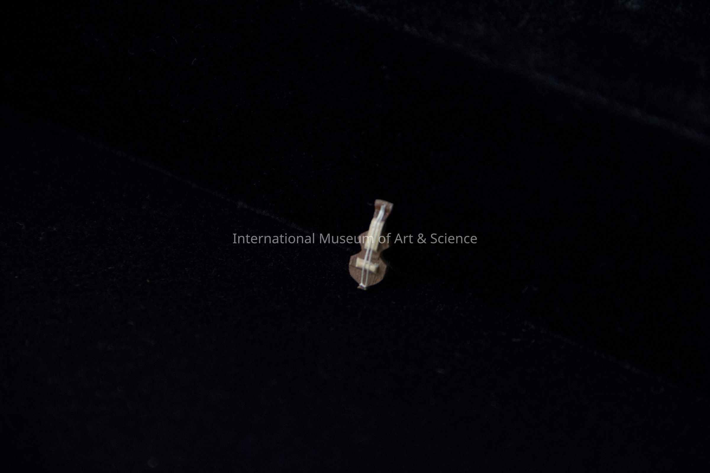 A miniature guitar. Finely shaped brown body with an overlay of beige wood at top; two strings at top; hole at center; tiny brown horizontal wood glued on top of beige wood.Dimensions