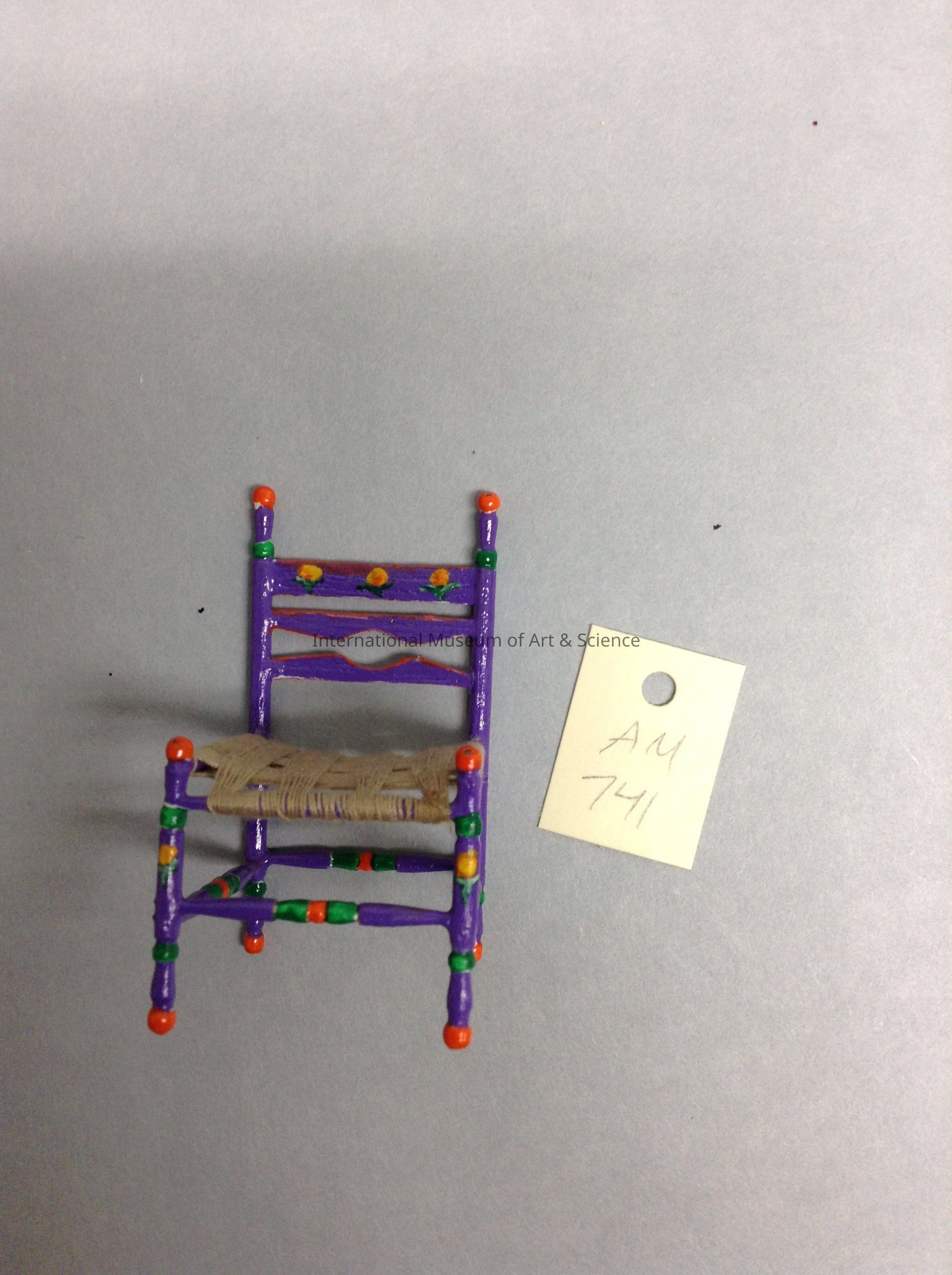 A miniature purple chair with detailing in colors of orange, green and yellow. The seat is made out of light brown thread. On the bottom of the seat there's a sticker that reads, "Peru". There's writting on the back of the chair that reads, "Patzcuaro".Artwork Details