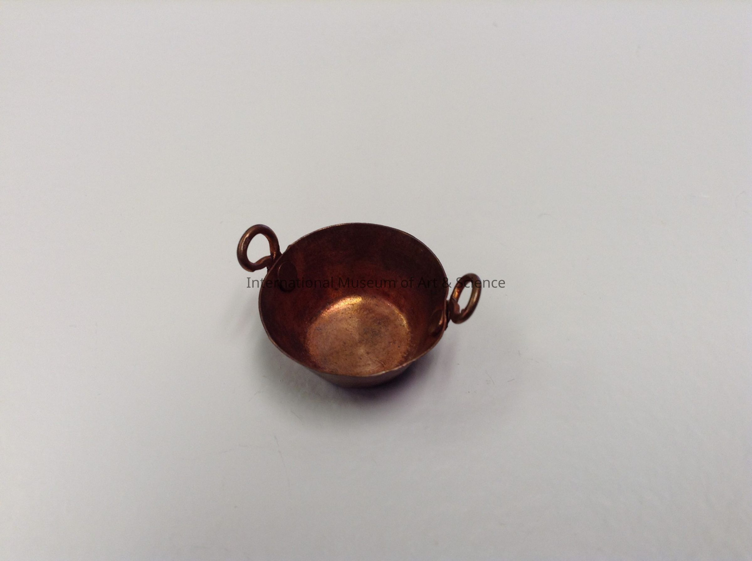 A miniature pot. The pot has an open mouth with copper wire handles on the sides.