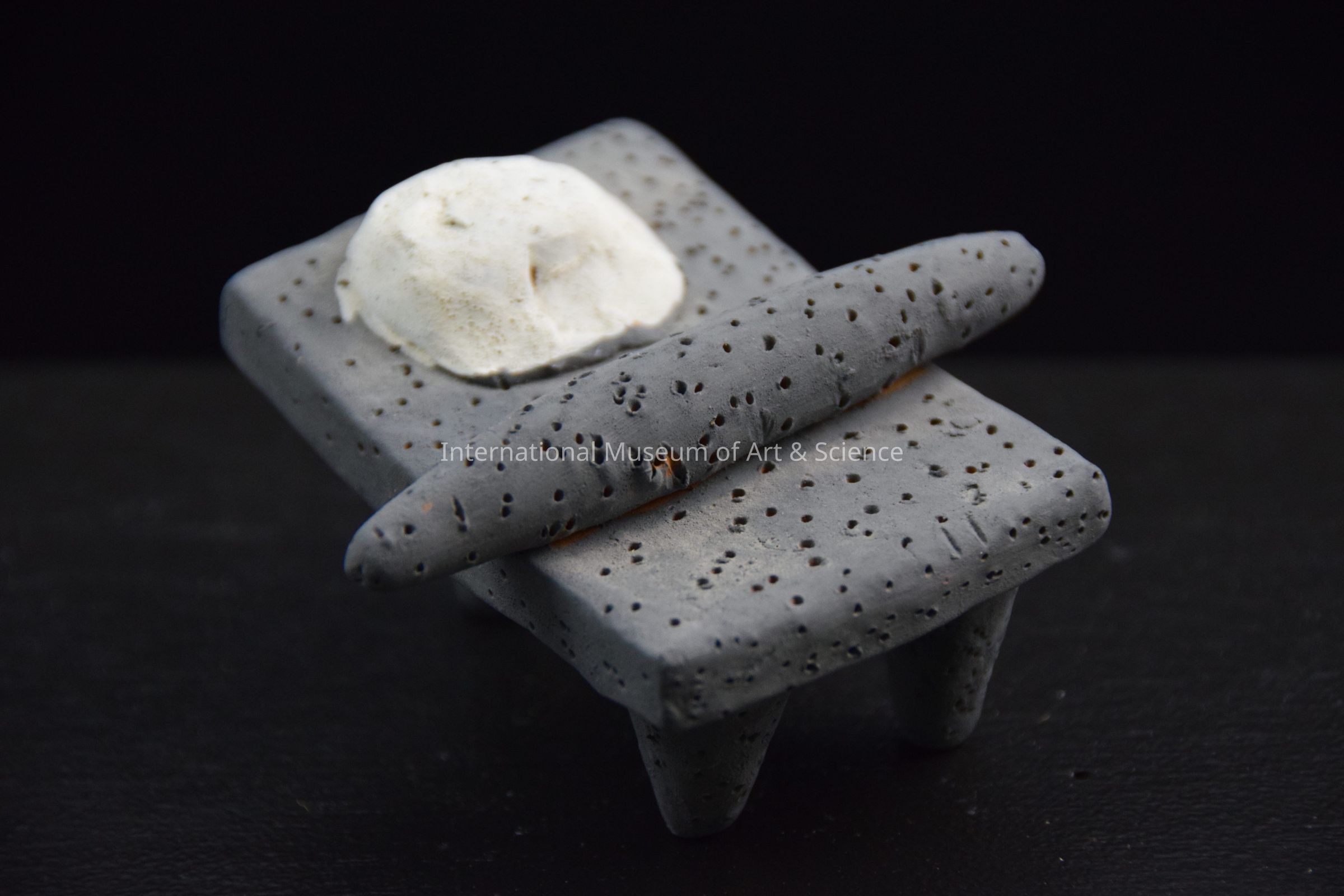 A painted clay bisque miniature table figurine. The table is a matate, it has three legs and is painted grey. On top is a matching grey rolling pin at one end and at the other is a pile of flour, painted white. It is part of a 40 piece wedding scene.Dimensions