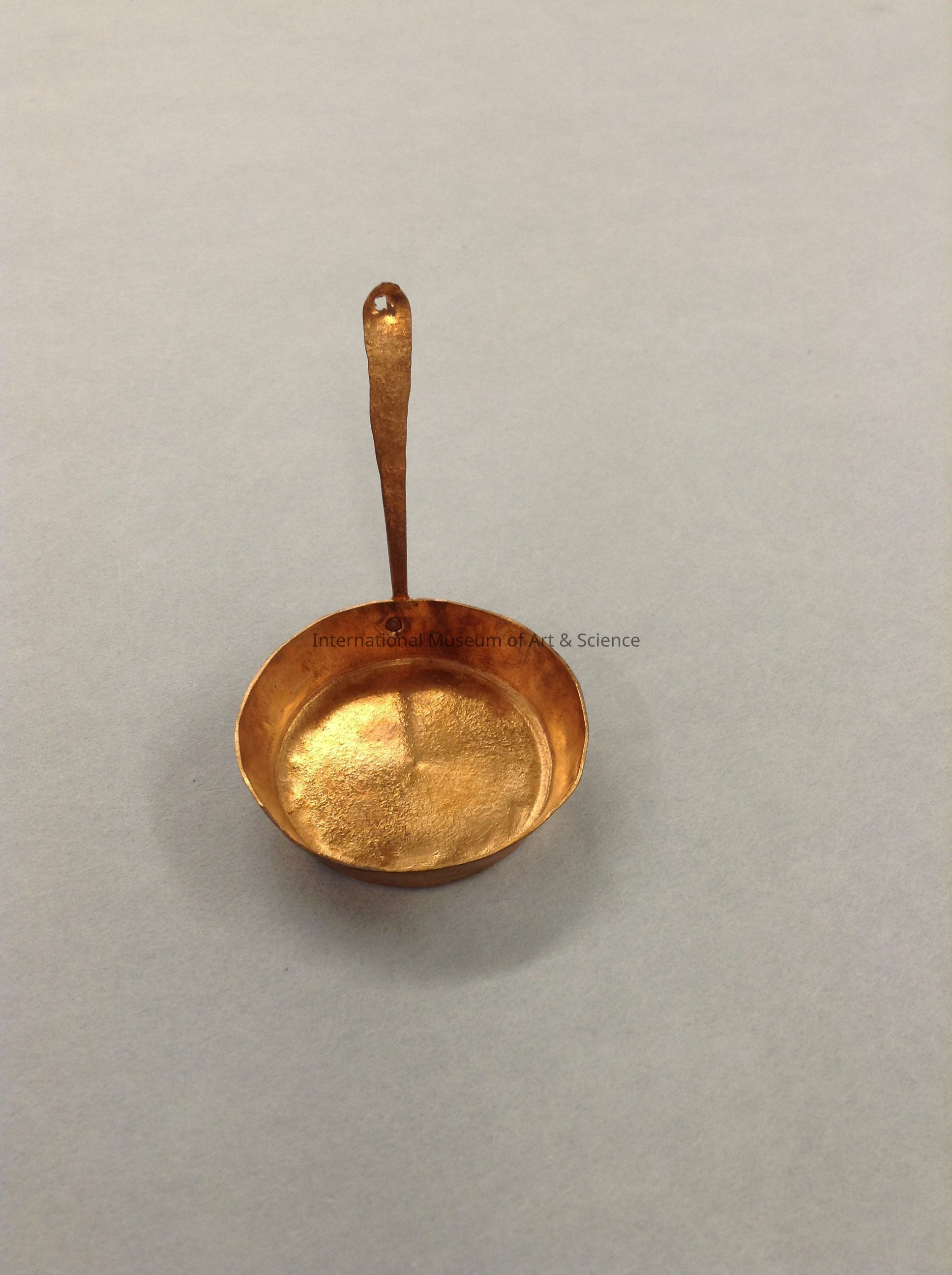 A miniature pan. The pan is shallow with a tall handle. It is part of a 14 piece kitchenware set.Dimensions