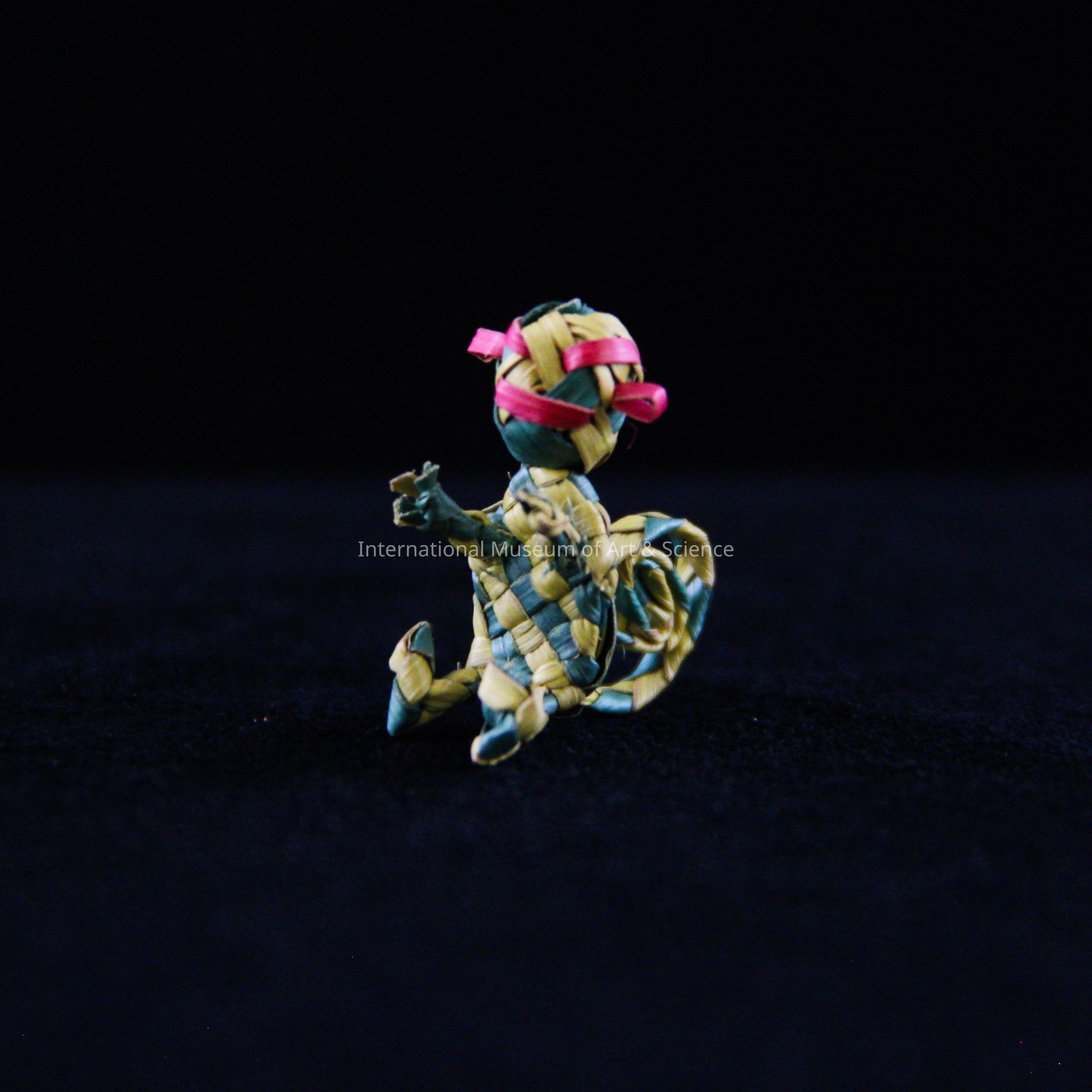 A miniature animal figurine. The animal is a small monkey made out of dyed, dried, split palm leaves.Dimensions