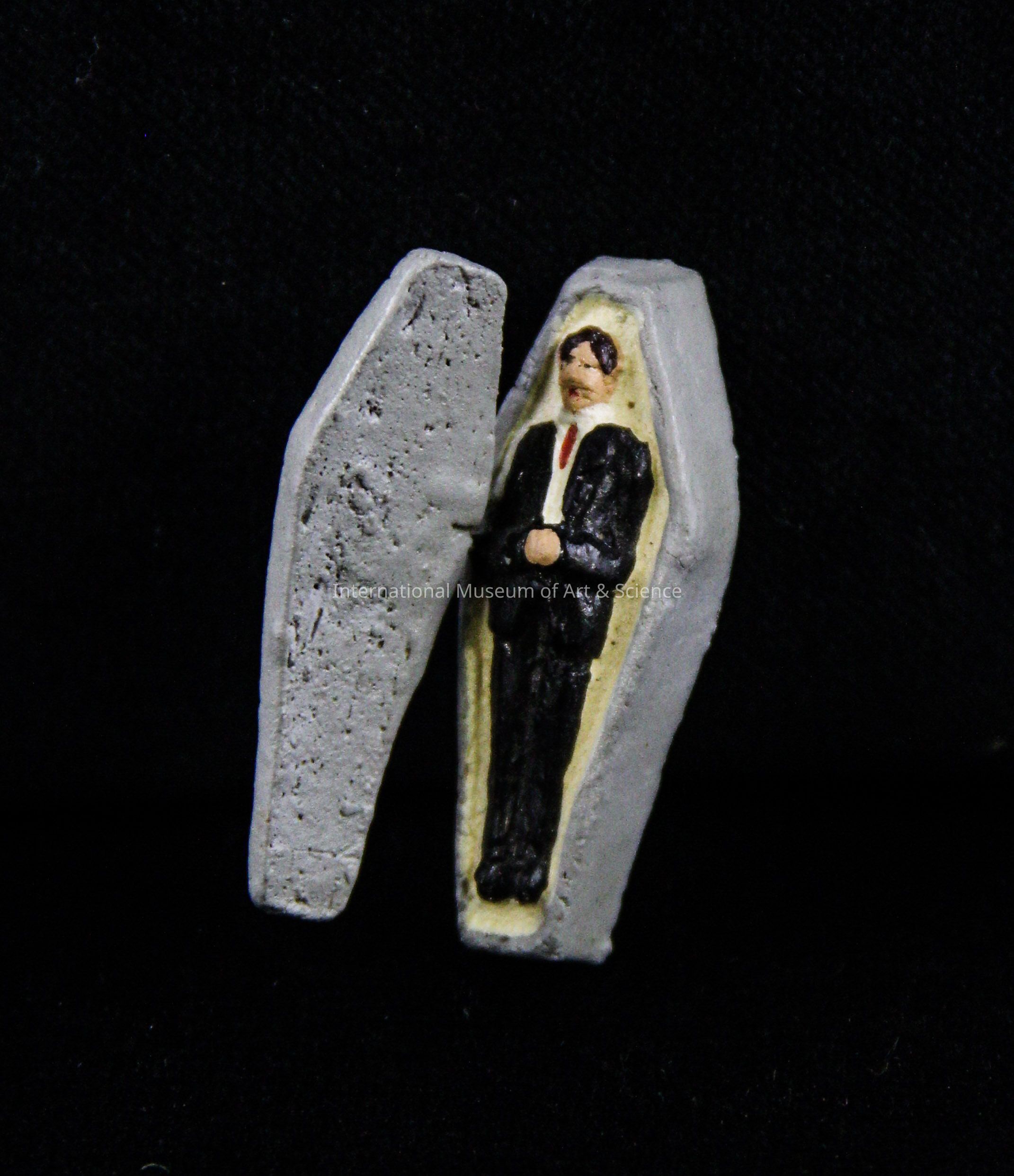 A miniature gray coffin with lid open exposing dead figure inside. The figure is dressed in a black suit with white shirt and red tie. He has brown hair. The coffin has a cream interior.Dimensions