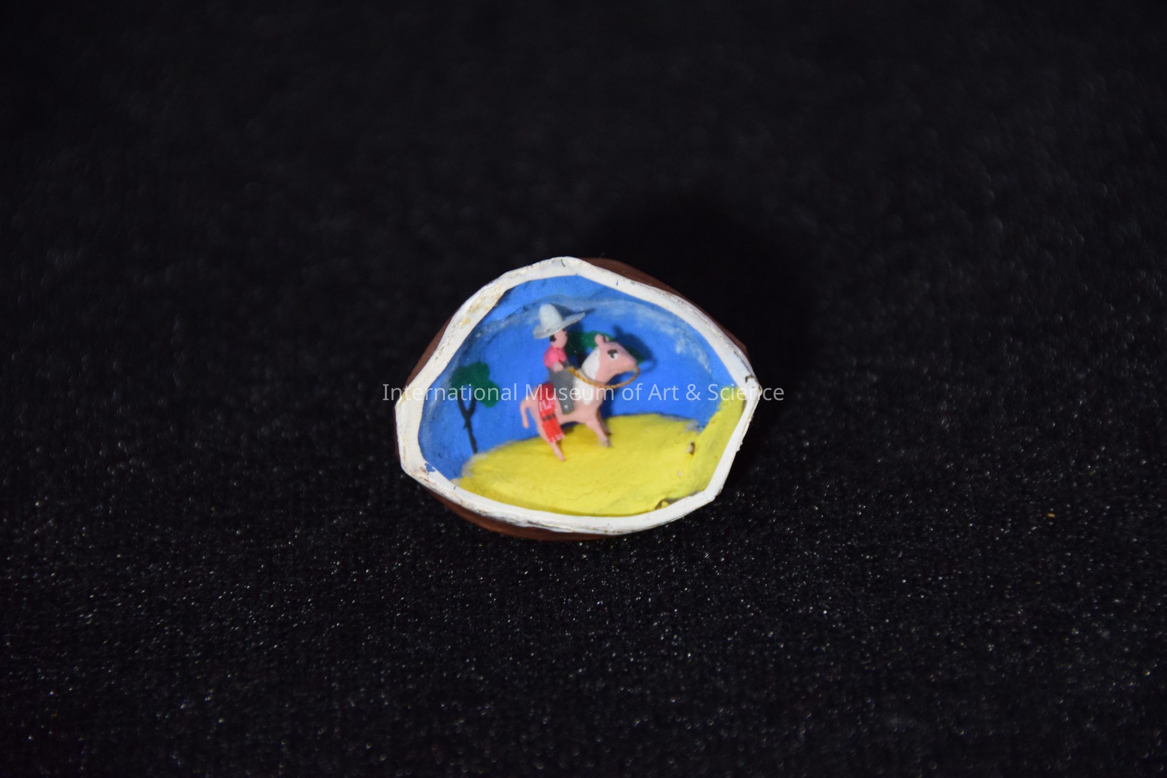 Walnut shell with miniature cowboy on horse. Background had dark blue sky; yellow ground; cowboy wearing cowboy hat, pink shirt, gray pants; peach painted horse with white mane.Artwork Details