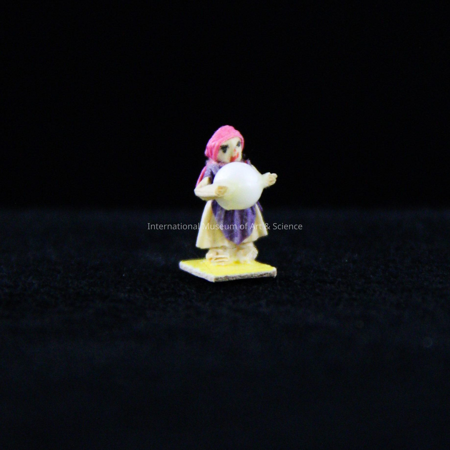 A small figurine made of dried corn husks. it is a woman carrying a white sphere (styrofoam) and wearing a hat. She is attached to yellow cardboard base.Artwork Details
