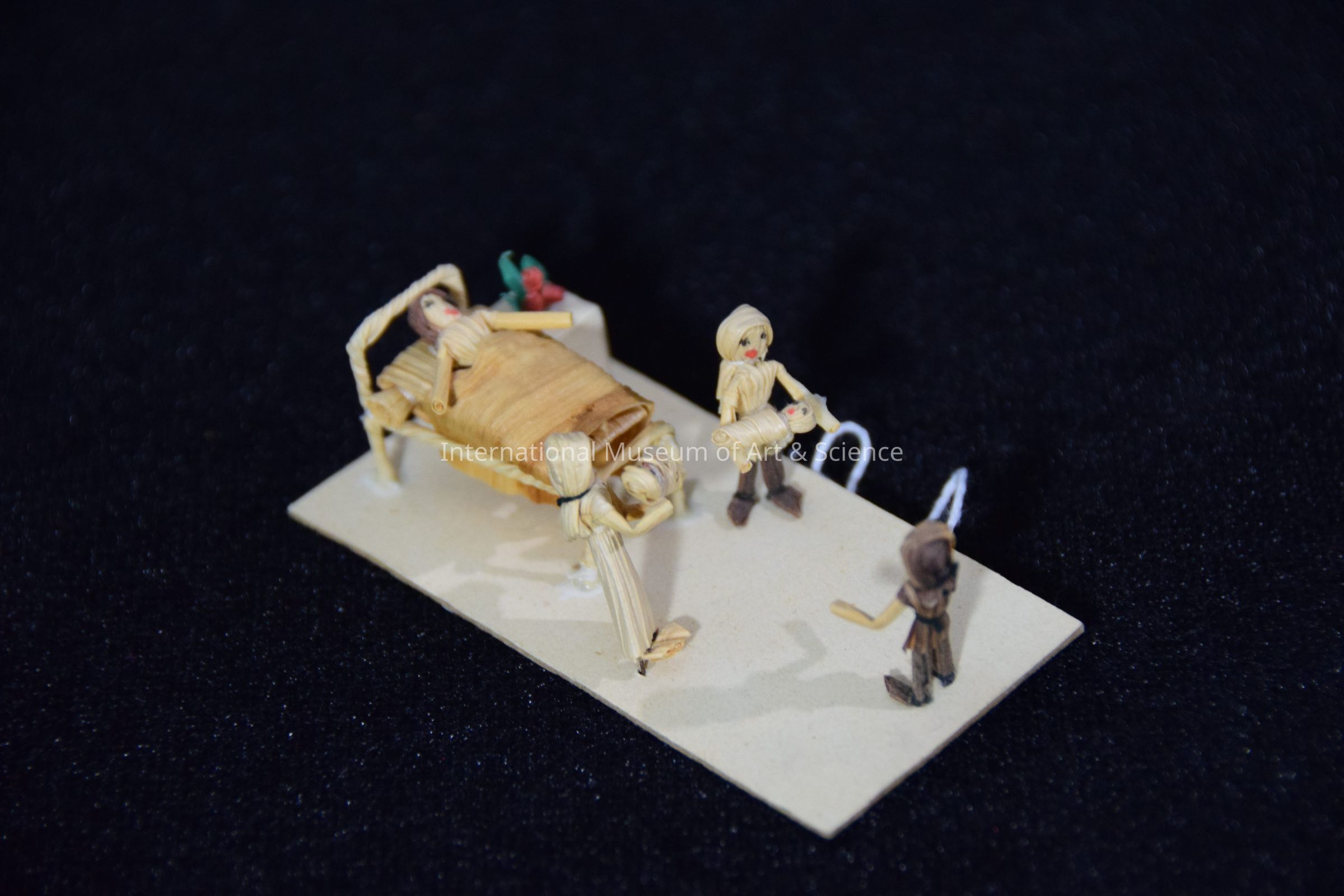 Miniature Operating Room Scene. Figures of corn husks attached with wire to cardboard base. Two figures holding infants stand at end of bed with woman in it; man stands facing infants/figures; red flowers by bedside.Artwork Details