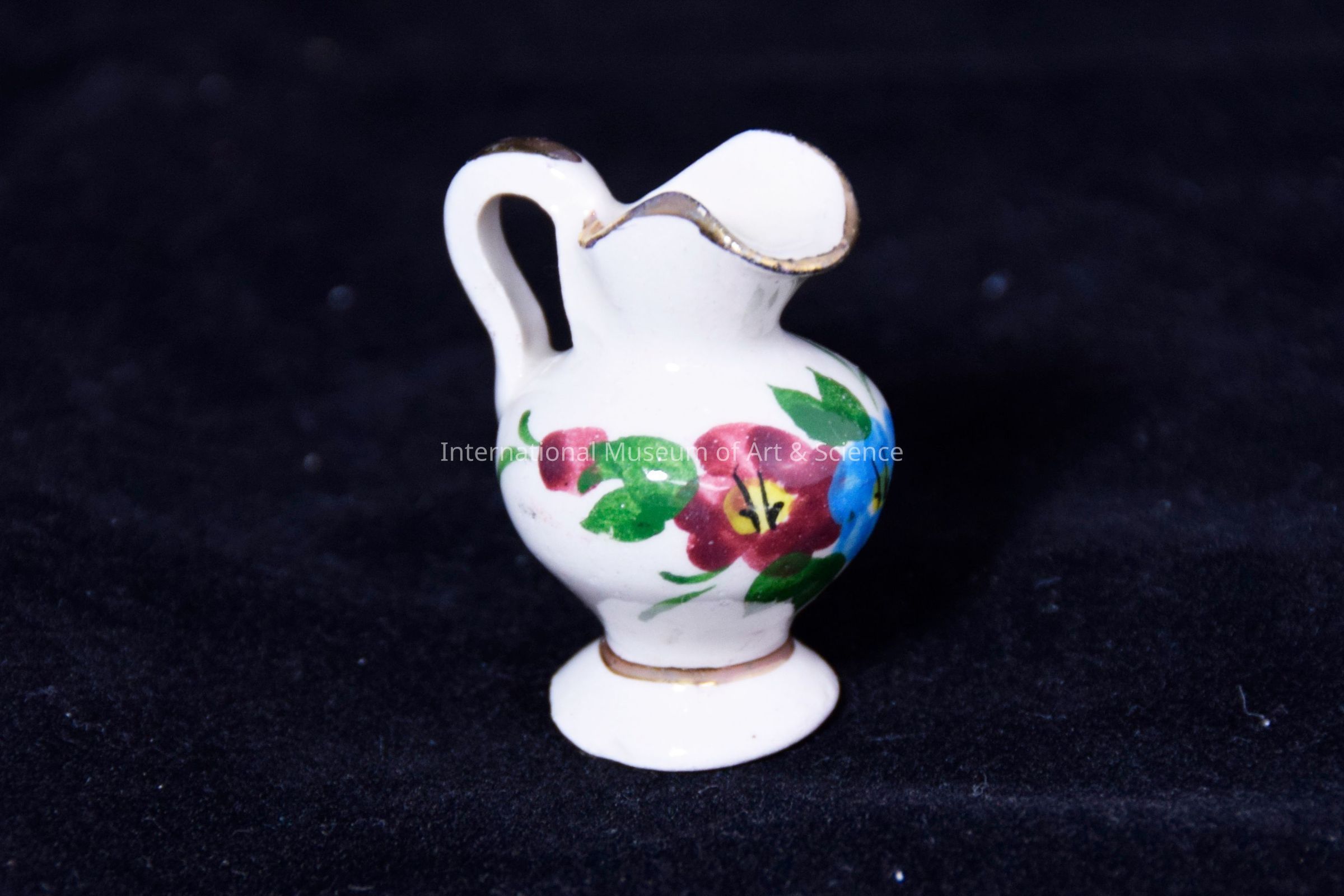 Miniature jug; cream body; blue and red flowers with green leaves; touch of gold on handle mouth and base.Made/Created