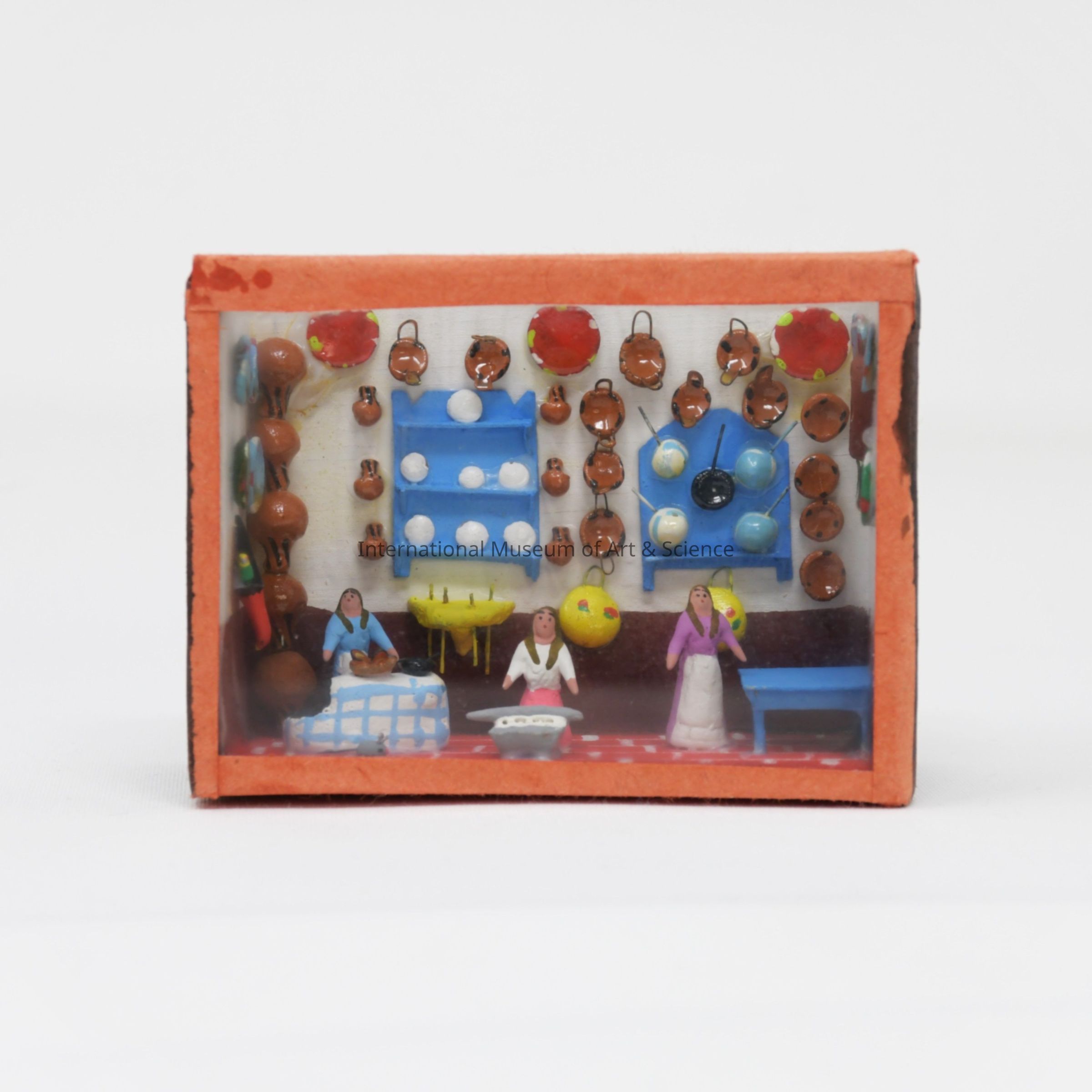 A wood and plastic display box depicting a kitchen with three female figures, a table, a metate, an oven, with pottery on the walls and a red brick floor.Artwork Details