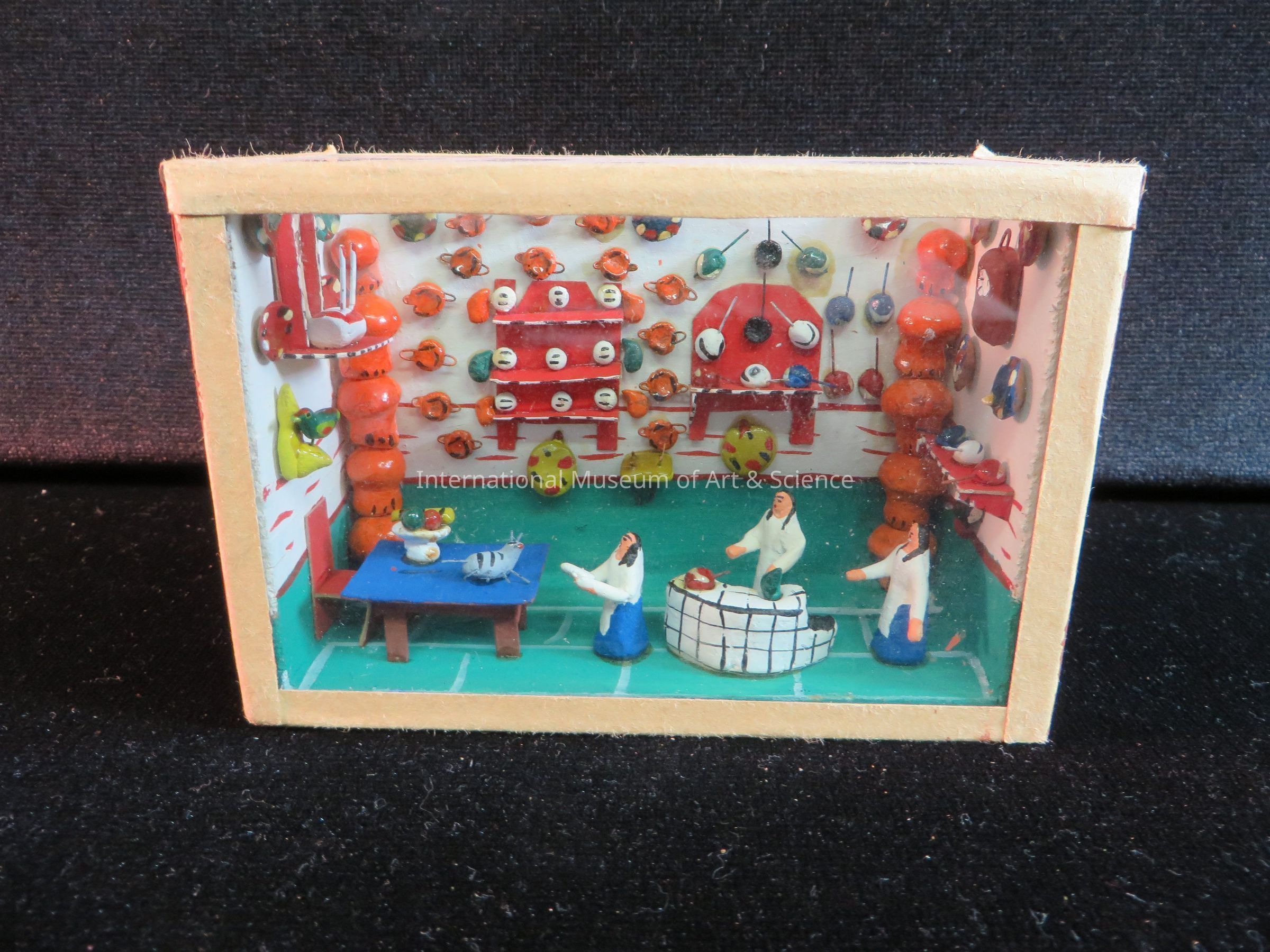 Miniature kitchen scene. The scene is set in a wooden box with a glass top and front. The characters inside are made of clay and painted. Shown are three women in a kitchen with many decorations on the walls. The piece is from Mexico.Artwork Details