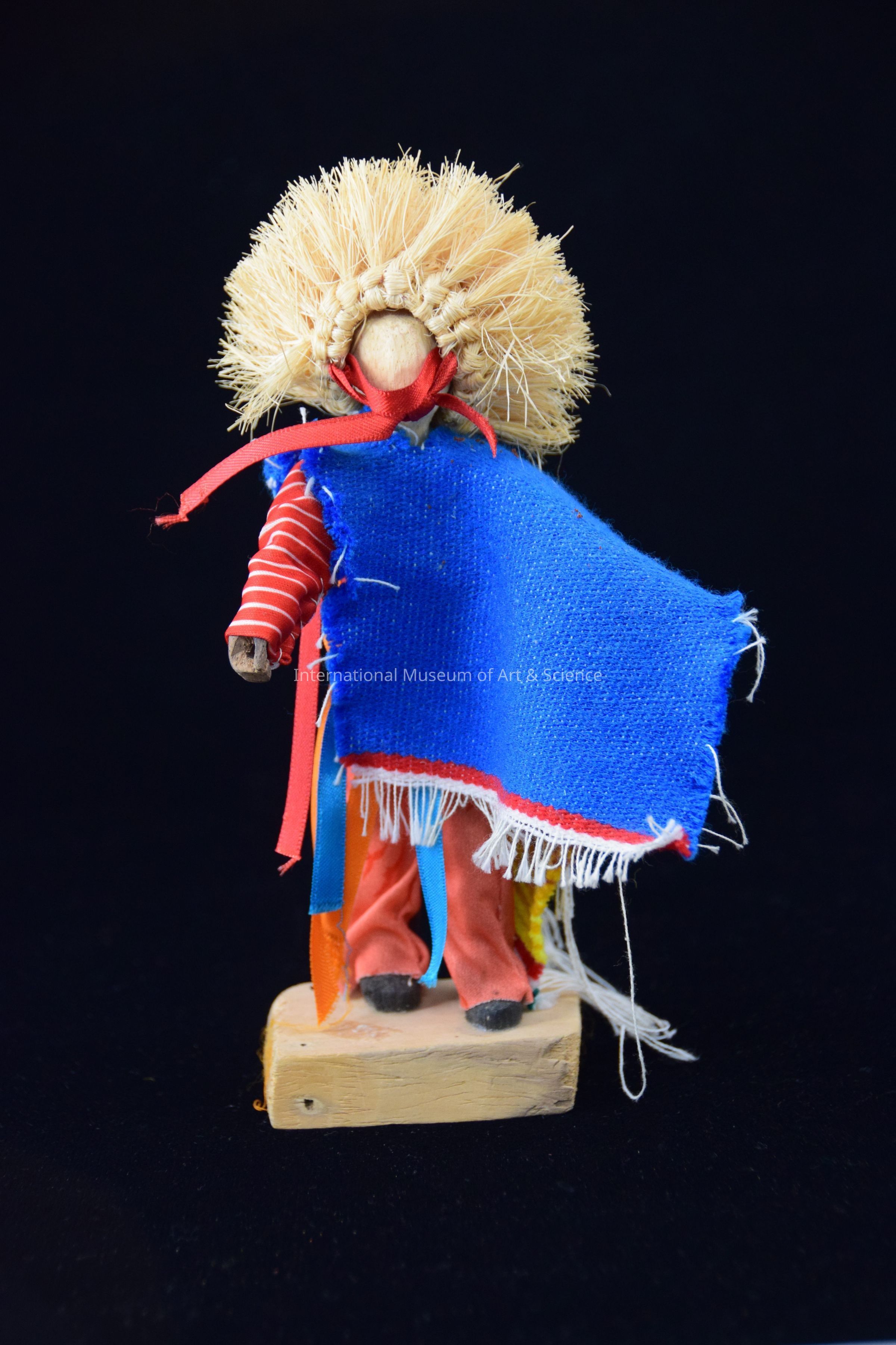 Miniature Parachico dancer. Headdress of ixtle; wears mask, dressed in orange/black print pants.Artwork Details