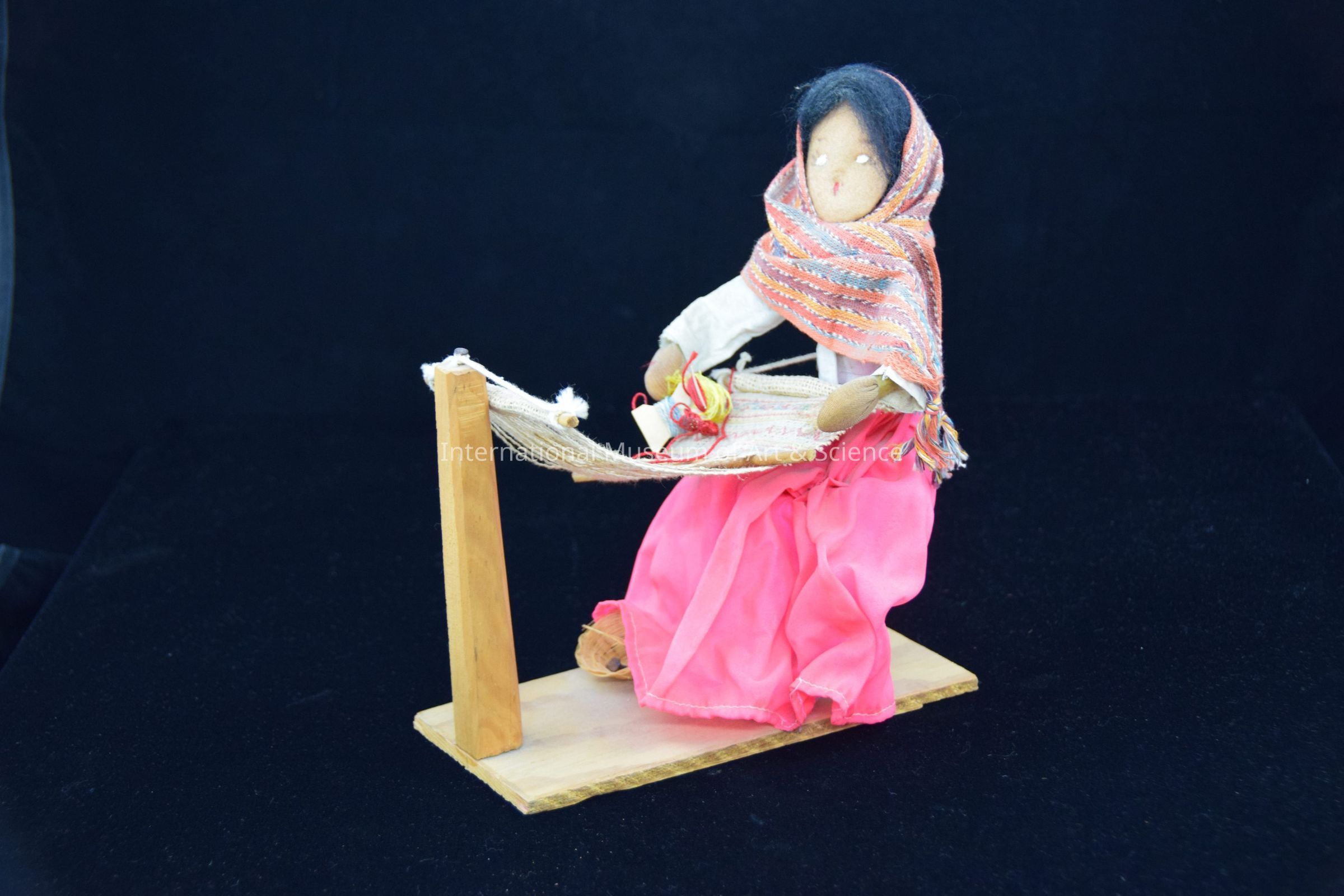 Miniature woman at backstrap loom sitting on tree stump; wearing white top and pink skirt.Made/Created