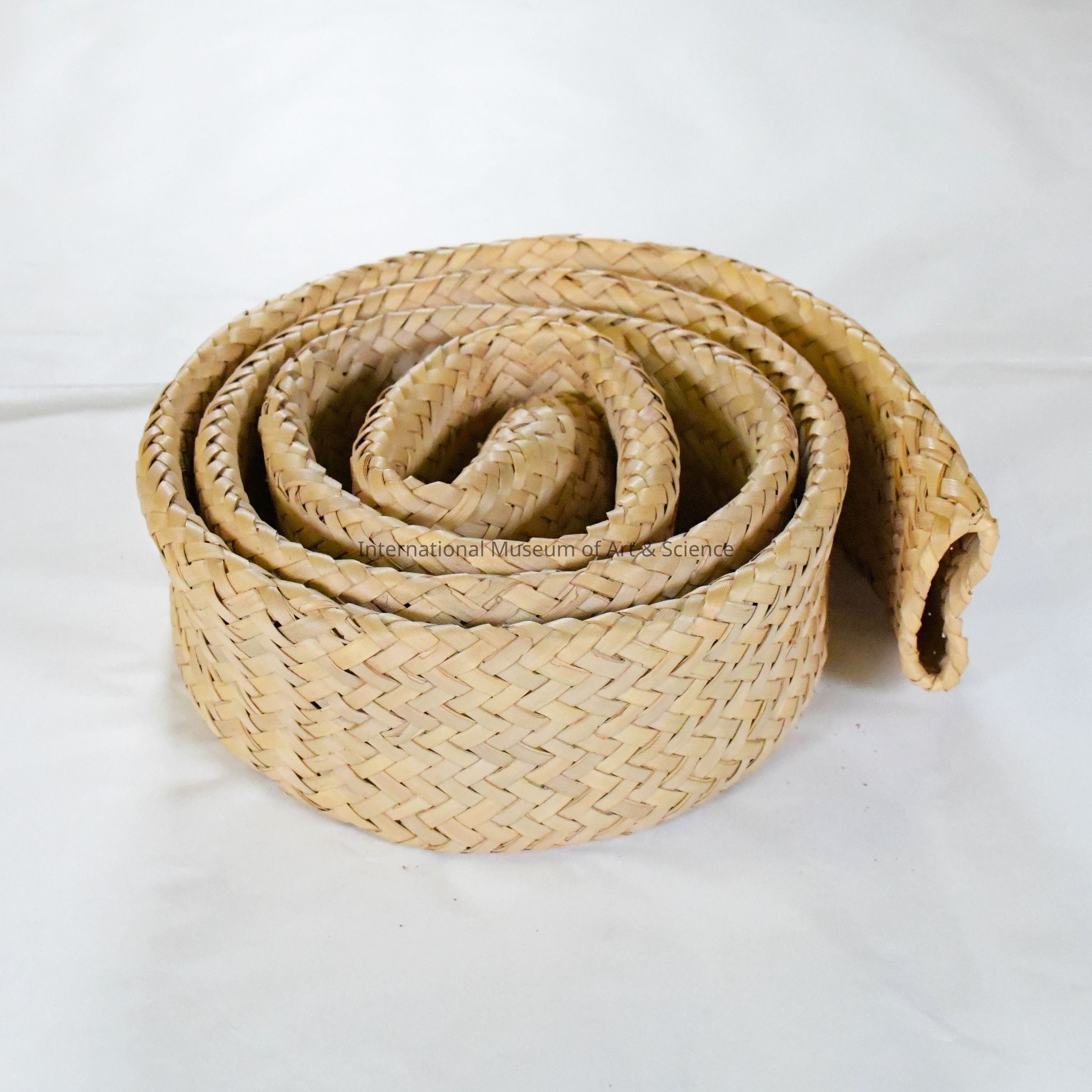 This belt is crafted from tightly woven soyate fiber that grows through the highlands of Oaxaca, exhibiting a characteristic golden-yellow hue. The fiber is meticulously braided using a "diagonal weave" technique and formed into a tube then coiled into a circular form for storage or display. The texture of the soyate is coarse yet pliable, typical of materials derived from palm or yucca leaves.Ethnography