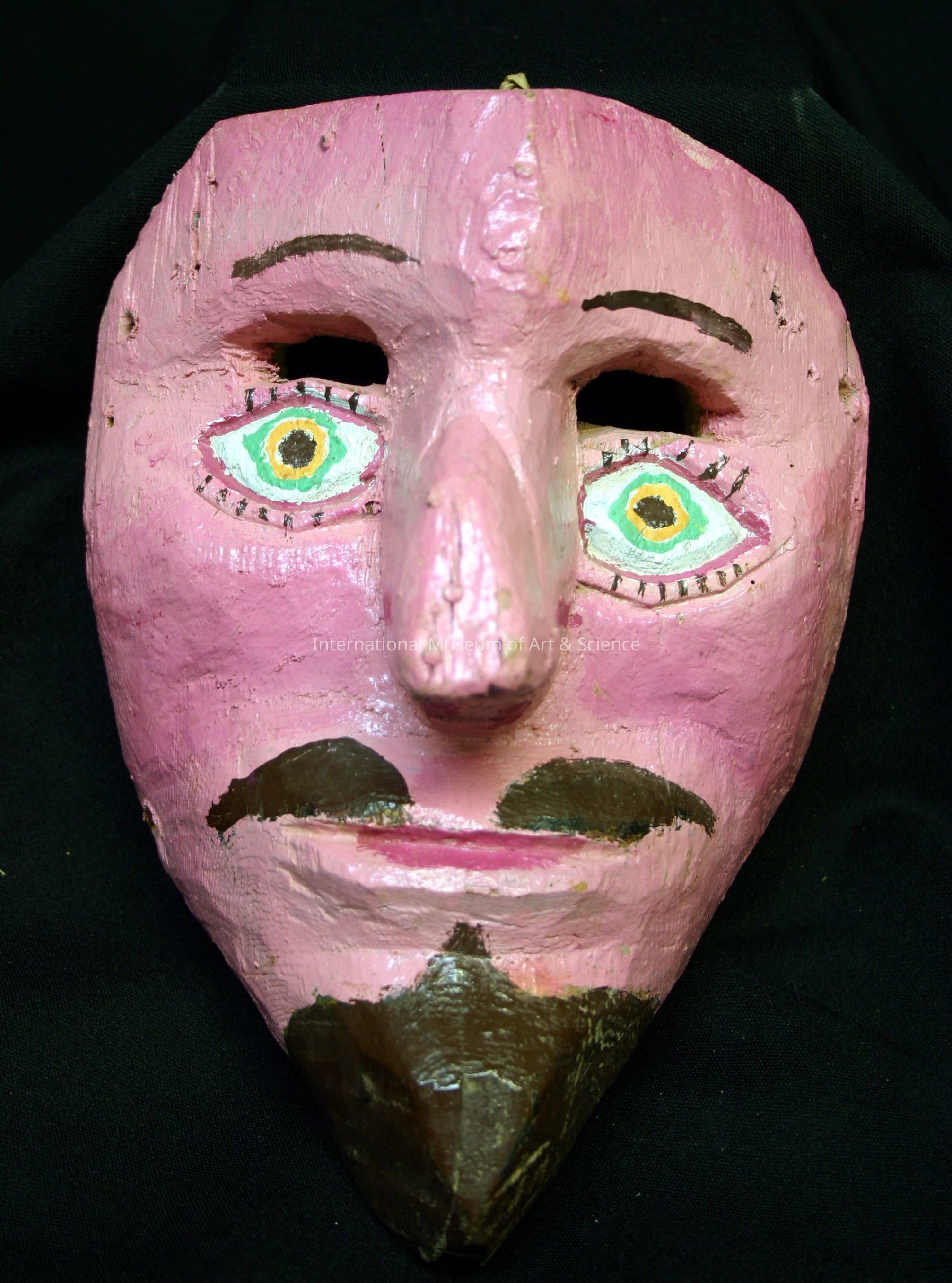 Moor mask. Overall bright pink face mask; green with orange eyes; brown painted eyebrows and moustache; brown pointed chin beard; protruded nose.Made/Created