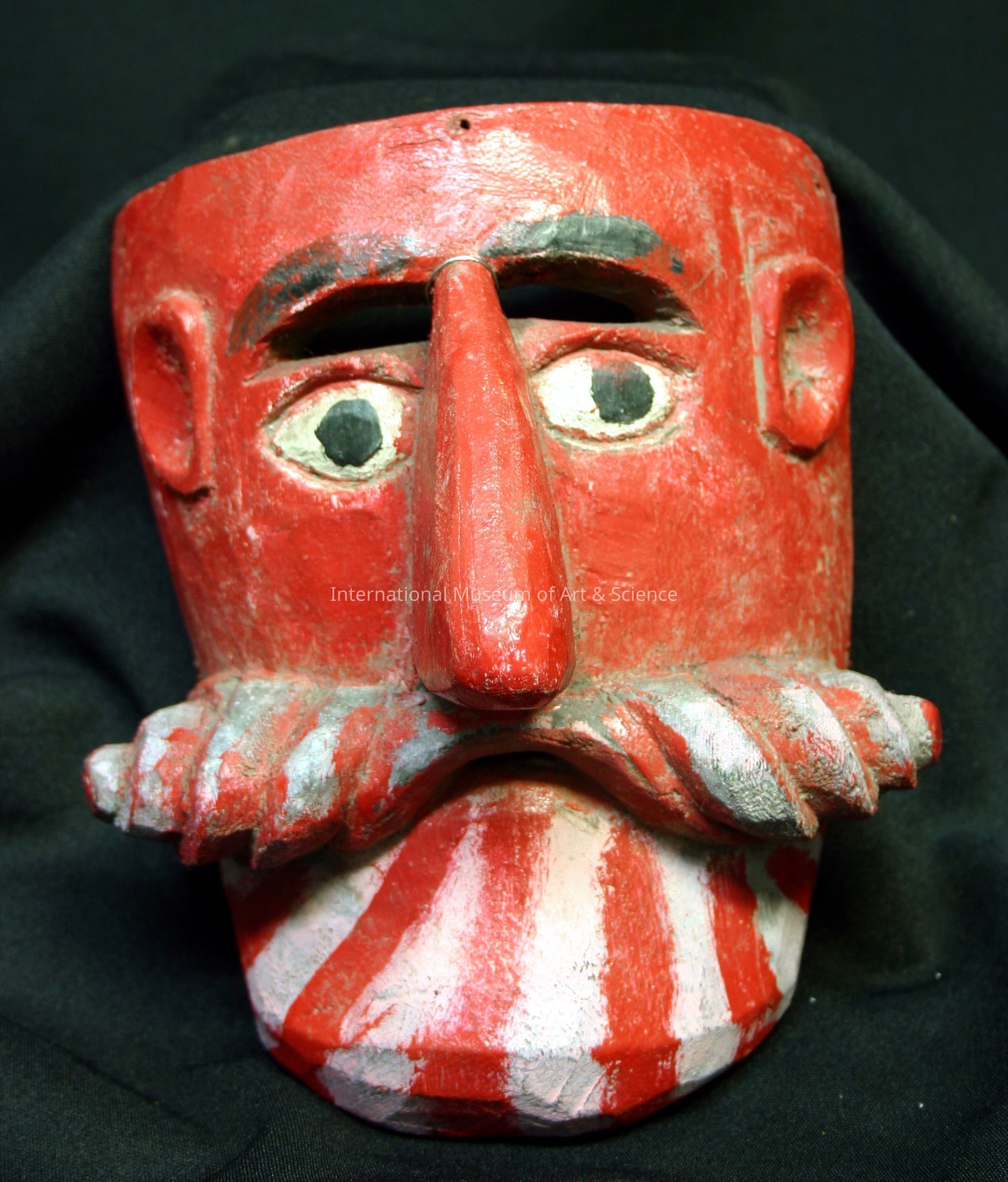 Moor mask. Moor mask has red face; pink striped beard; large twirled stripped moustache. Black and white eyes, black eyebrows.Dimensions