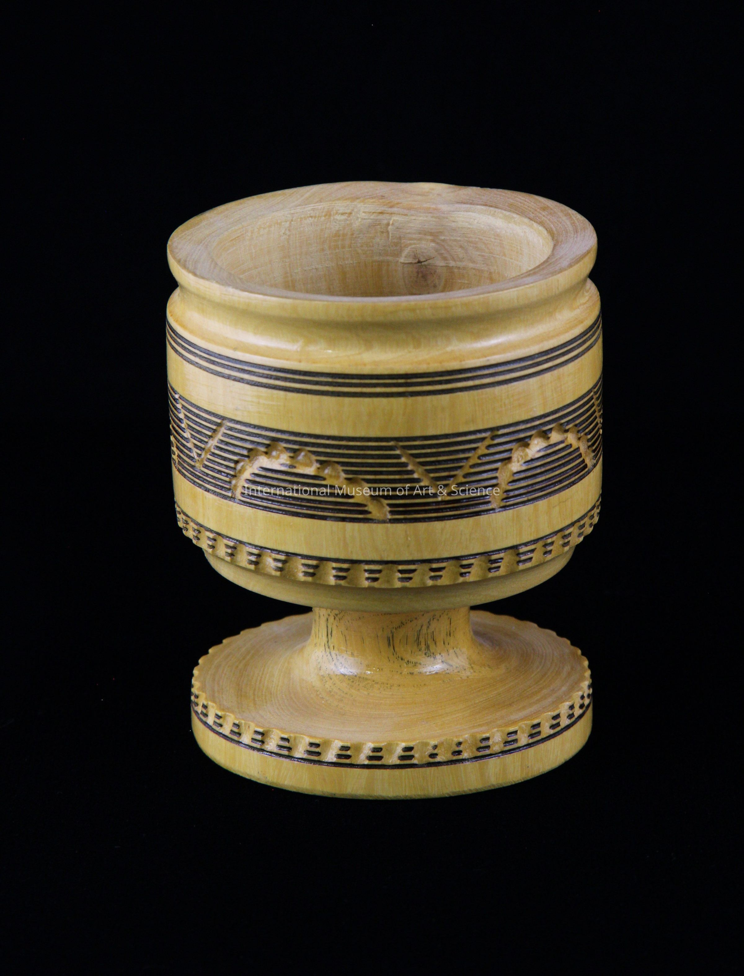 A wooden mortar bowl. The mortar vessel has a short neck with a round base. There are both machine and hand done designs carved into the exterior.Made/Created