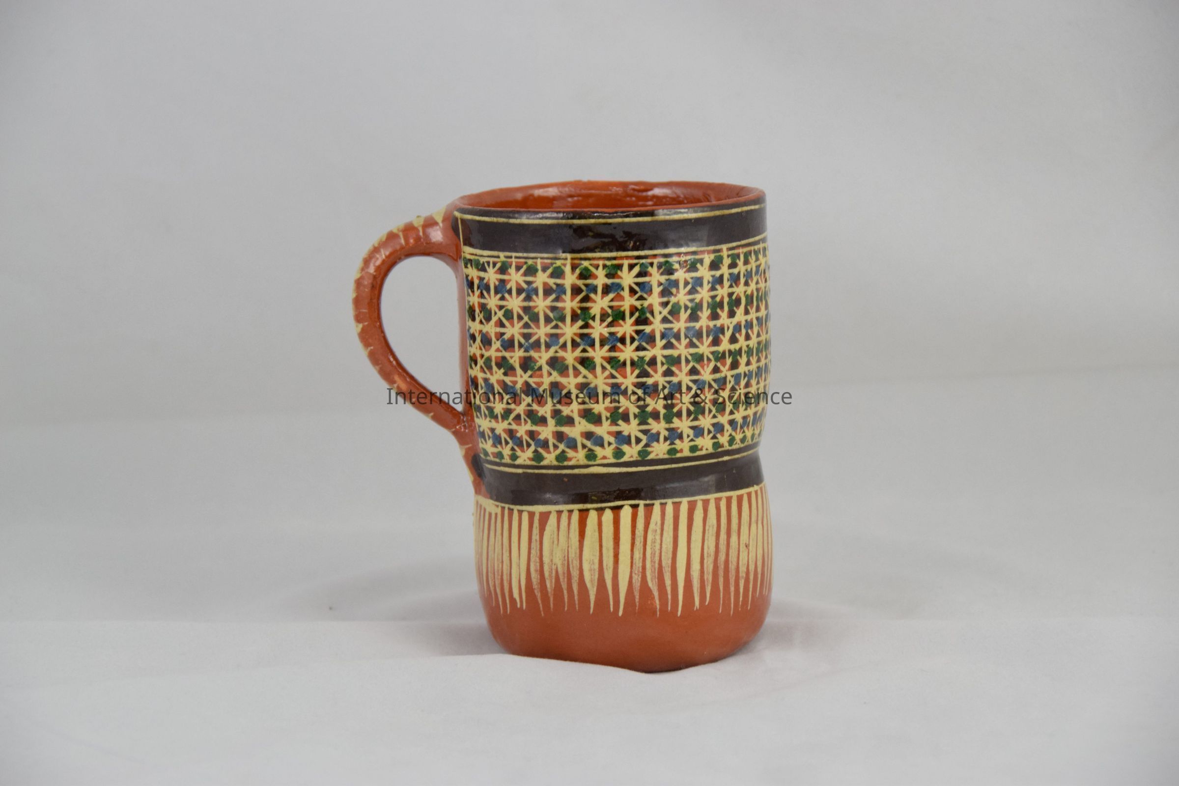 Mug. Tlaquepaque, Jalisco. Artist unknown. Clay, paint. 1988. Deep red-orange clay nug with one handle painted in cream horizontal stripes; body decorated with cross-hatching cream lines over brown lines and blue with green dots; vertical stripes in the bottom section; two separate brown bands.Dimensions