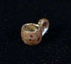 A miniature brown cup. The cup is ceramic and glazed in brown speckles.