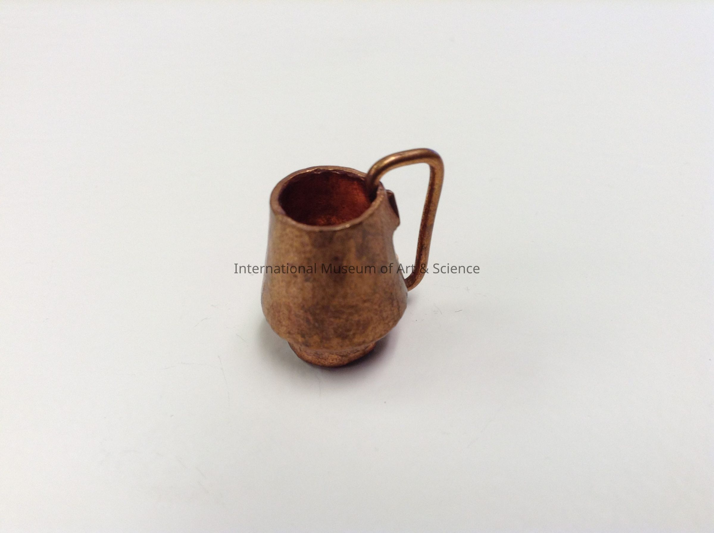 A miniature mug. The mug is fashioned out of copper, with a copper wire serving as the handle.