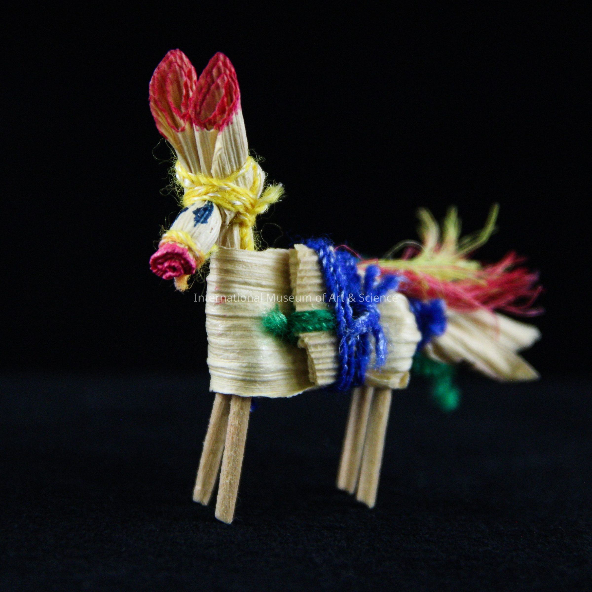A small animal figurine. The animal is a llama made of corn husk leaves. The ears and mouth are painted red, and the eyes green. It is carrying multi-colored fibers wrapped with dark blue and green string.Artwork Details
