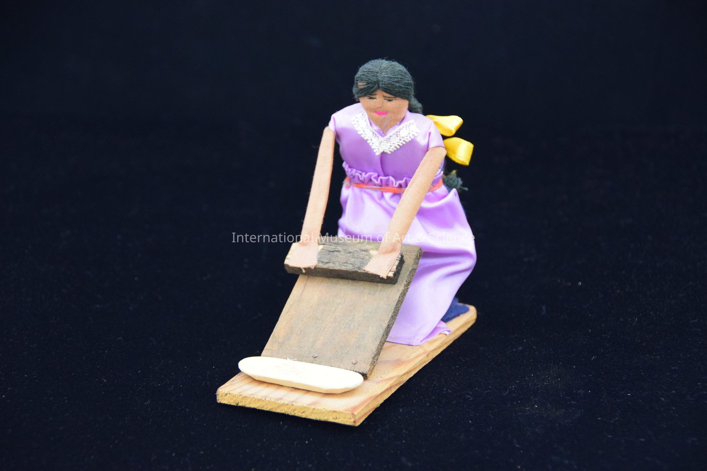 Muneca (doll); figure grinding masa on wooden base, moveable. The doll has string hair with a yellow ribbon. She is wearing a lavendar dress and has a pull string on base.Artwork Details