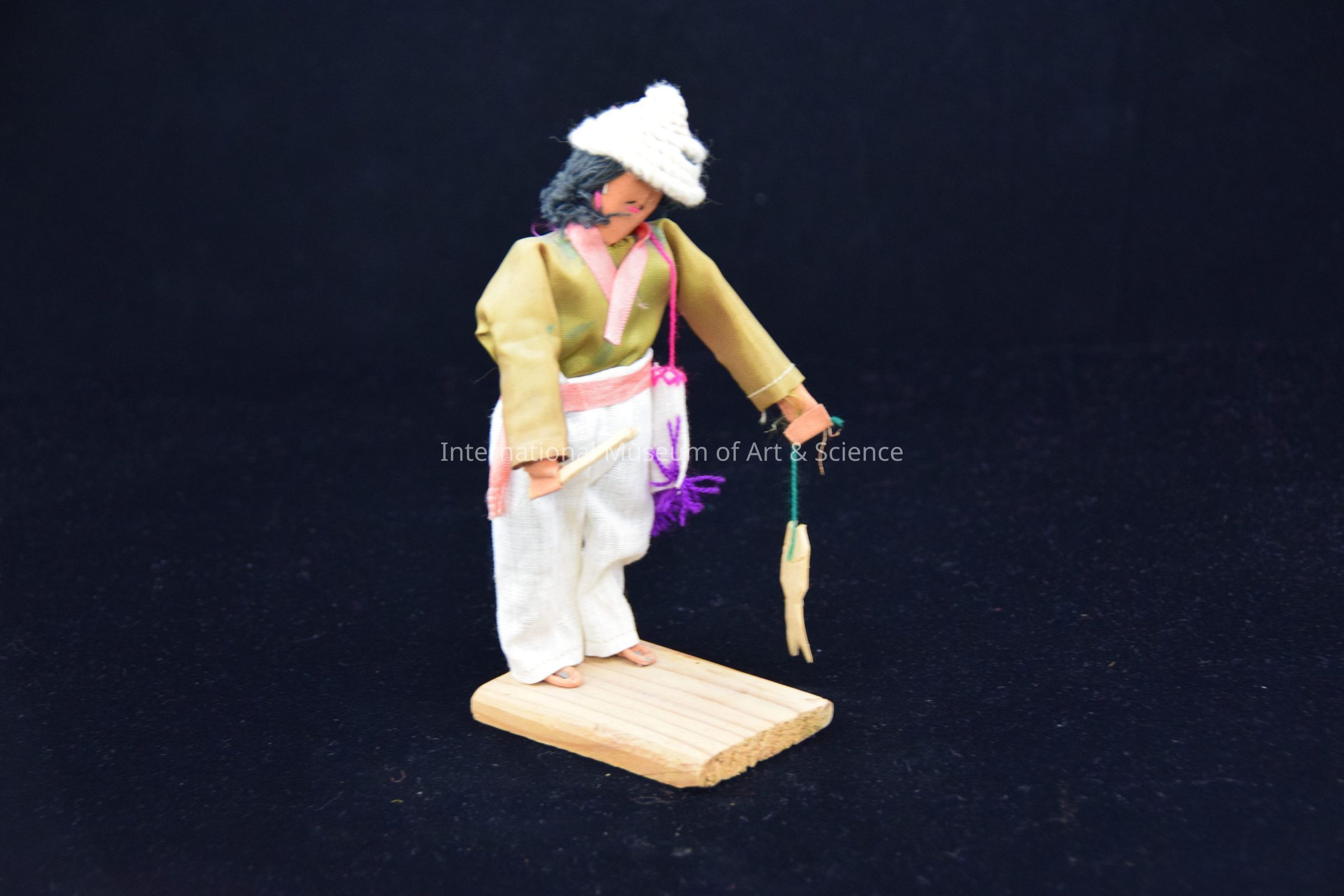 Muneca (doll); cloth figure of man carrying fish in one hand and a fishing pole in the other. The doll stands on a wooden base. The doll has a string hat and yarn hair, an onlive colored shirt, cream colored pants with a coral sash. The doll also has a shoulder bag.Artwork Details