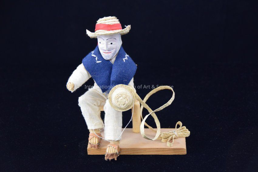 Muneca (doll); carved wood figure of sombrero maker, wearing sombrero and blue jorongo on wooden base with wooden chair;Artwork Details