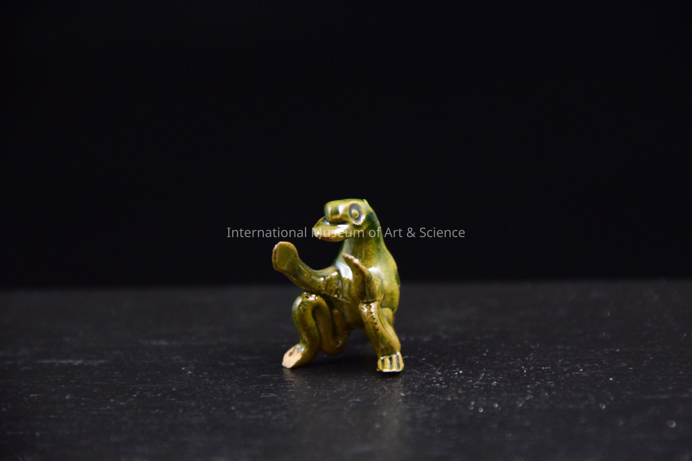 A small ceramic figurine of an animal. The animal is sitting on its hind with his hands up for clapping. The figurine is glazed in green. It is part of of a group of five miniature animal musican figurines.