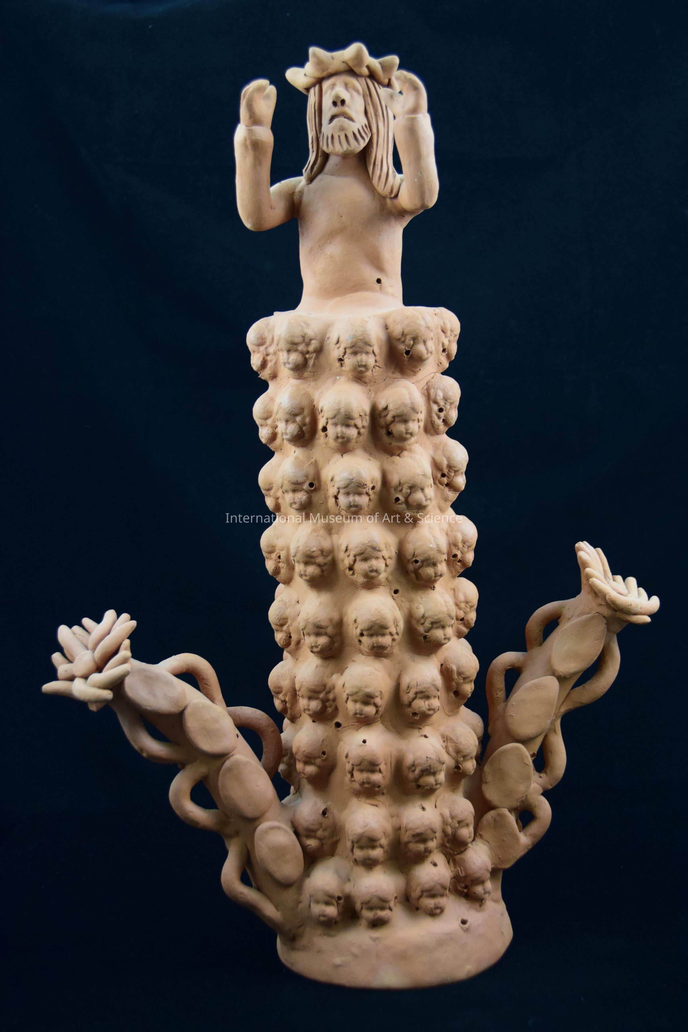 An unpainted ceramic sculpture of Christ's body rising out of a tower of baby angel heads. There are flowering cactus prongs on each side of the tower.Made/Created