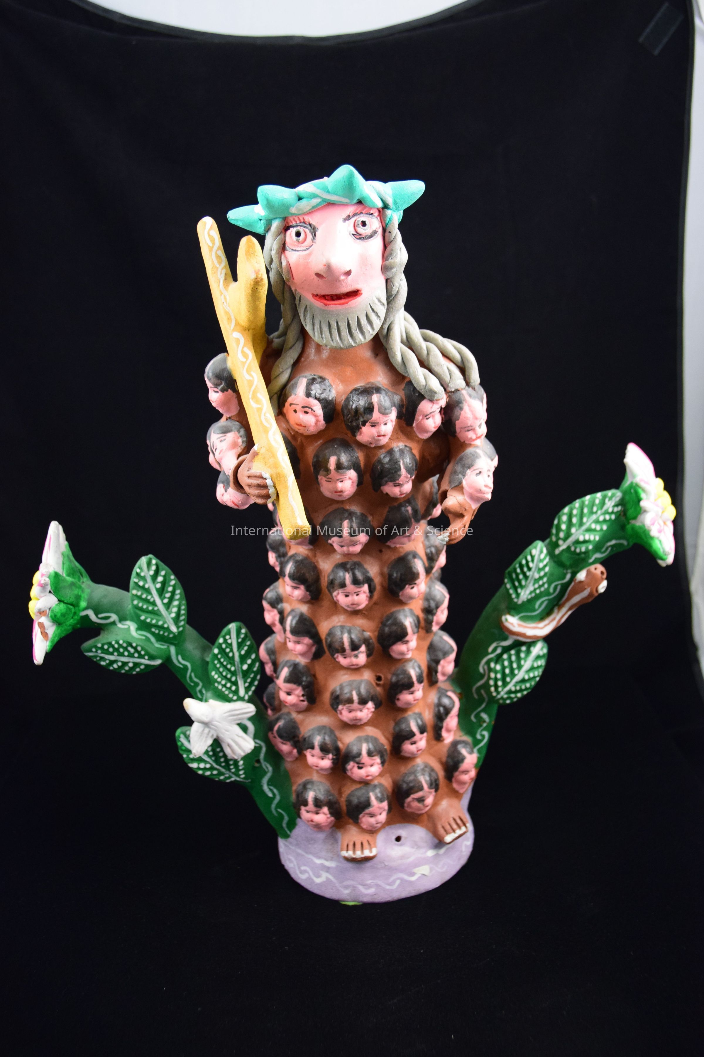 A ceramic standing Christ figure. The body is covered with infant heads of pink flesh color. The figure holds yellow cross and is wearing a green crown over gray hair. There are two green cactus plants with pink and white flowers, one with a brown snake and white bird.Artwork Details
