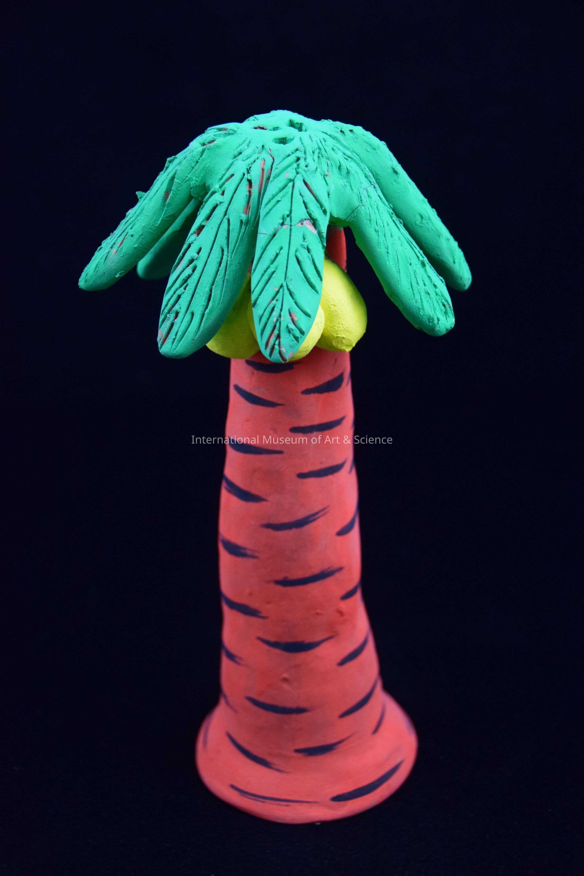 A ceramic figurine of a palm tree. The tree has a orange painted trunk with black detailing, Green palm leaves, and three yellow coconuts. It is part of a 16 piece Navivity Scene.Dimensions