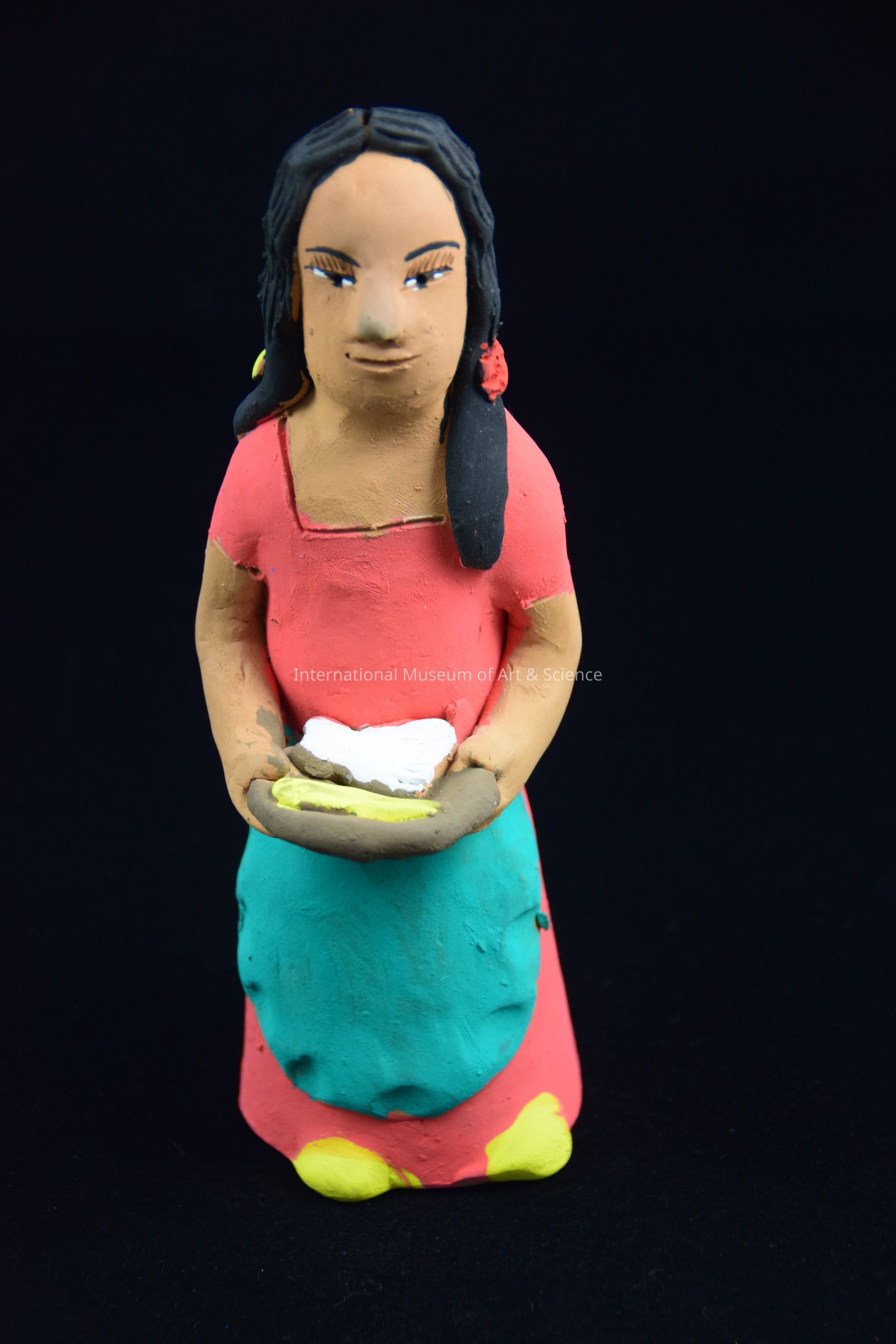 A clay figurine of a woman standing holding bowl of white and yellow food. She has black hair, a pink dress, green apron, and yellow shoes. Part of 16 piece nativity scene by Josefina Aguilar, painted bisque clay figurines.Dimensions