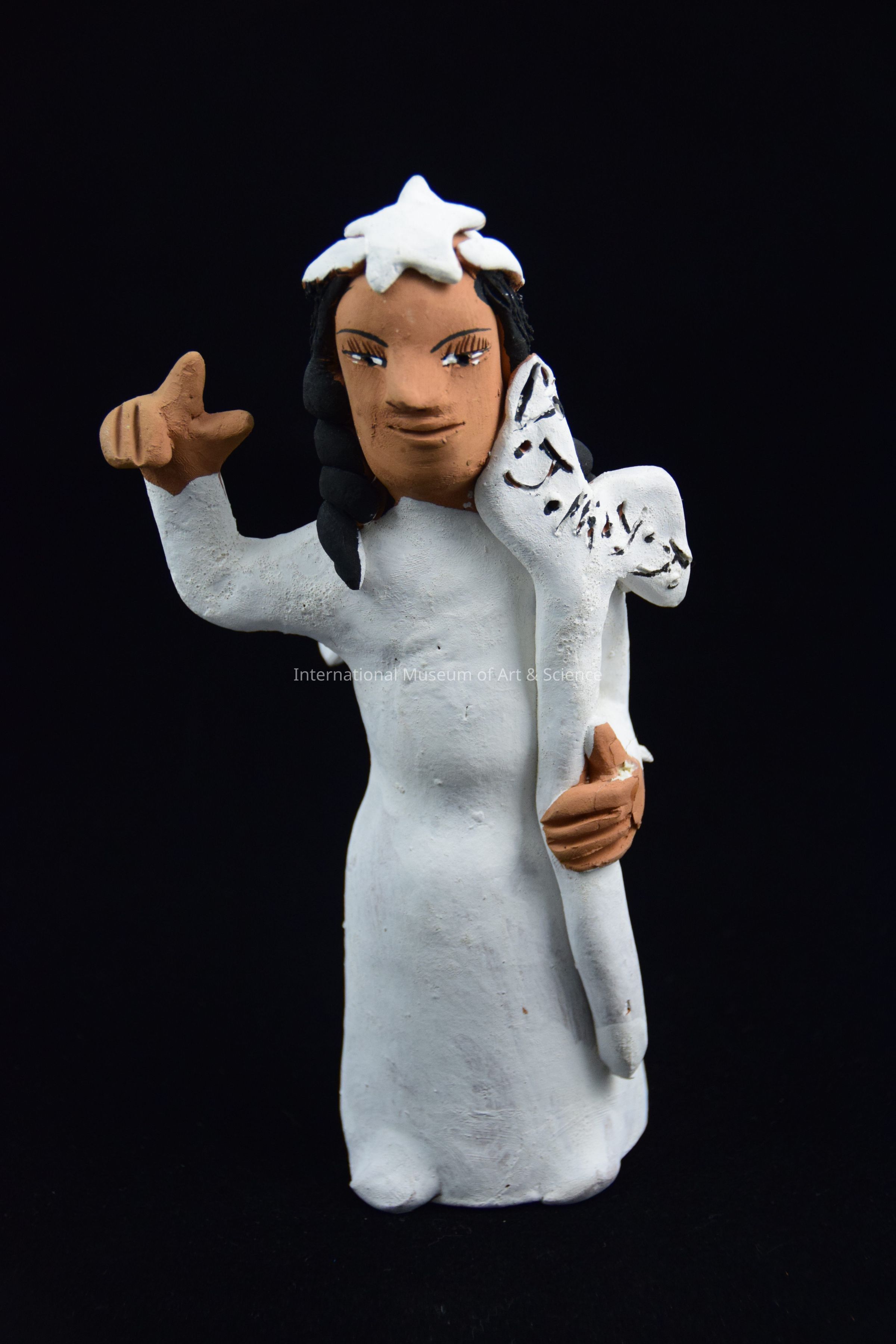 A clay figurine of an angel, standing holding one arm up, holding a white object inscribed "J.M. y J." meaning Jesus, Mary and Joseph, wearing white garment and white star in black hair, angel wings protrude in back. Part of 16 piece nativity scene by Josefina Aguilar, painted bisque clay figurines.Dimensions