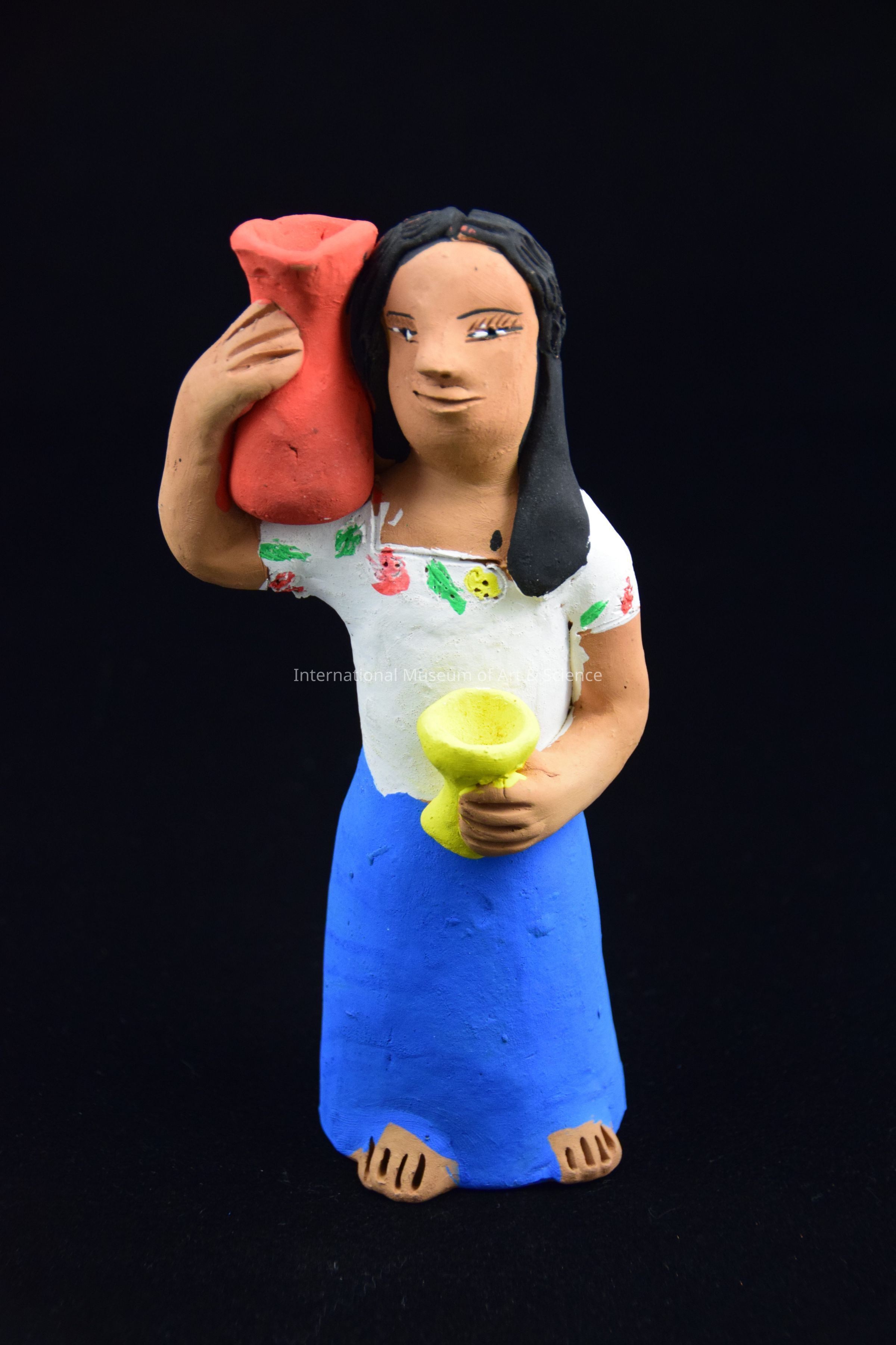 A clay figurine of a woman standing with large red jug on her shoulder and yellow goblet in her hand. She has black hair, and is wearing a white blouse and blue shirt. Part of 16 piece nativity scene by Josefina Aguilar, painted bisque clay figurines.Dimensions