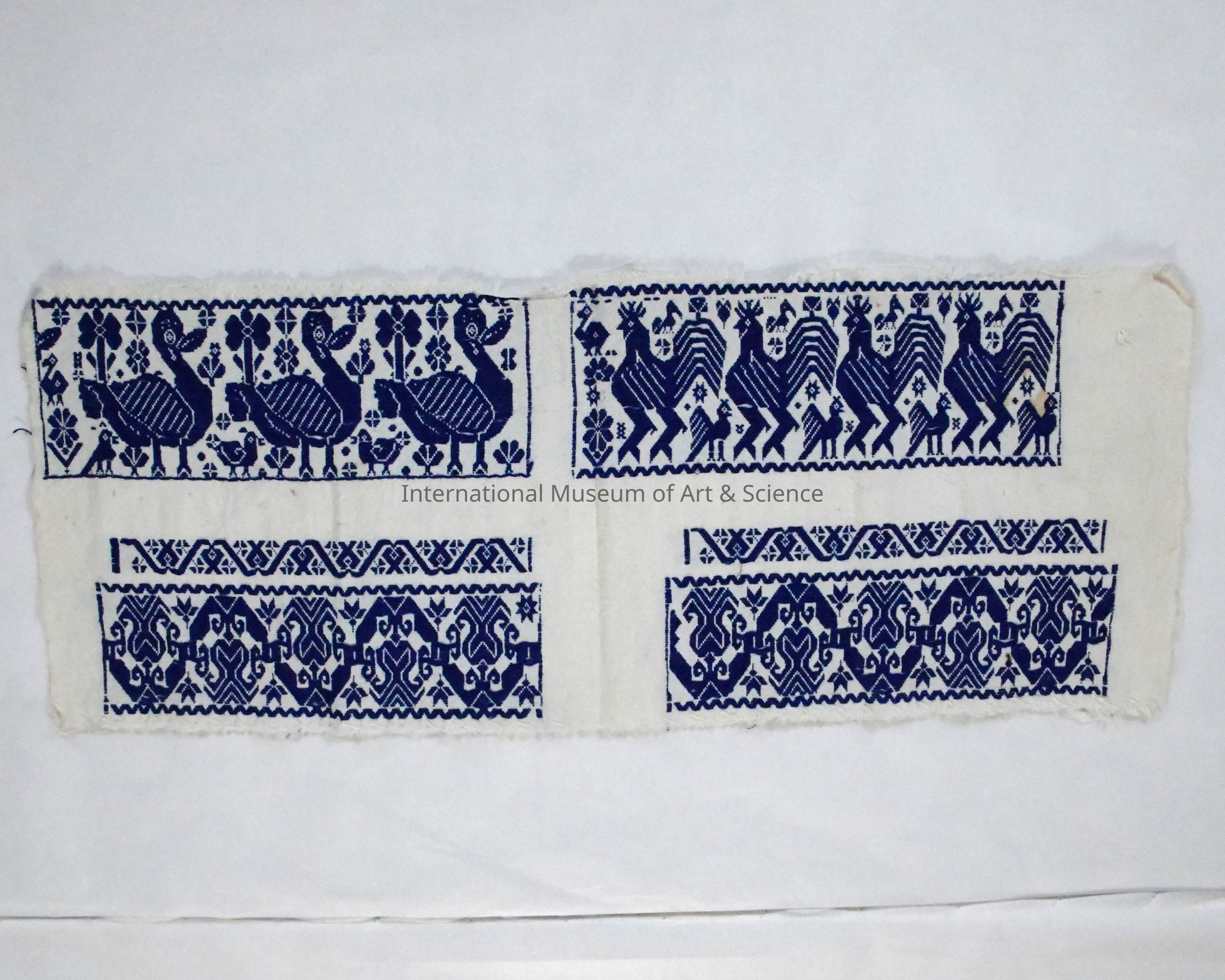 This hand-woven embroidered textile panel represents components of a traditional blouse, crafted using the distinctive embroidery techniques of Huelacapixtla. The intricate patterns feature stylized animals, possibly birds and roosters, arranged symmetrically. The use of deep blue thread on a (discolored) white fabric base highlights the contrast and precision of the design. This panel, likely intended for the upper chest and sleeves of a blouse, reflect the artistic heritage of the artisans from Huelacapixtla.Ethnography