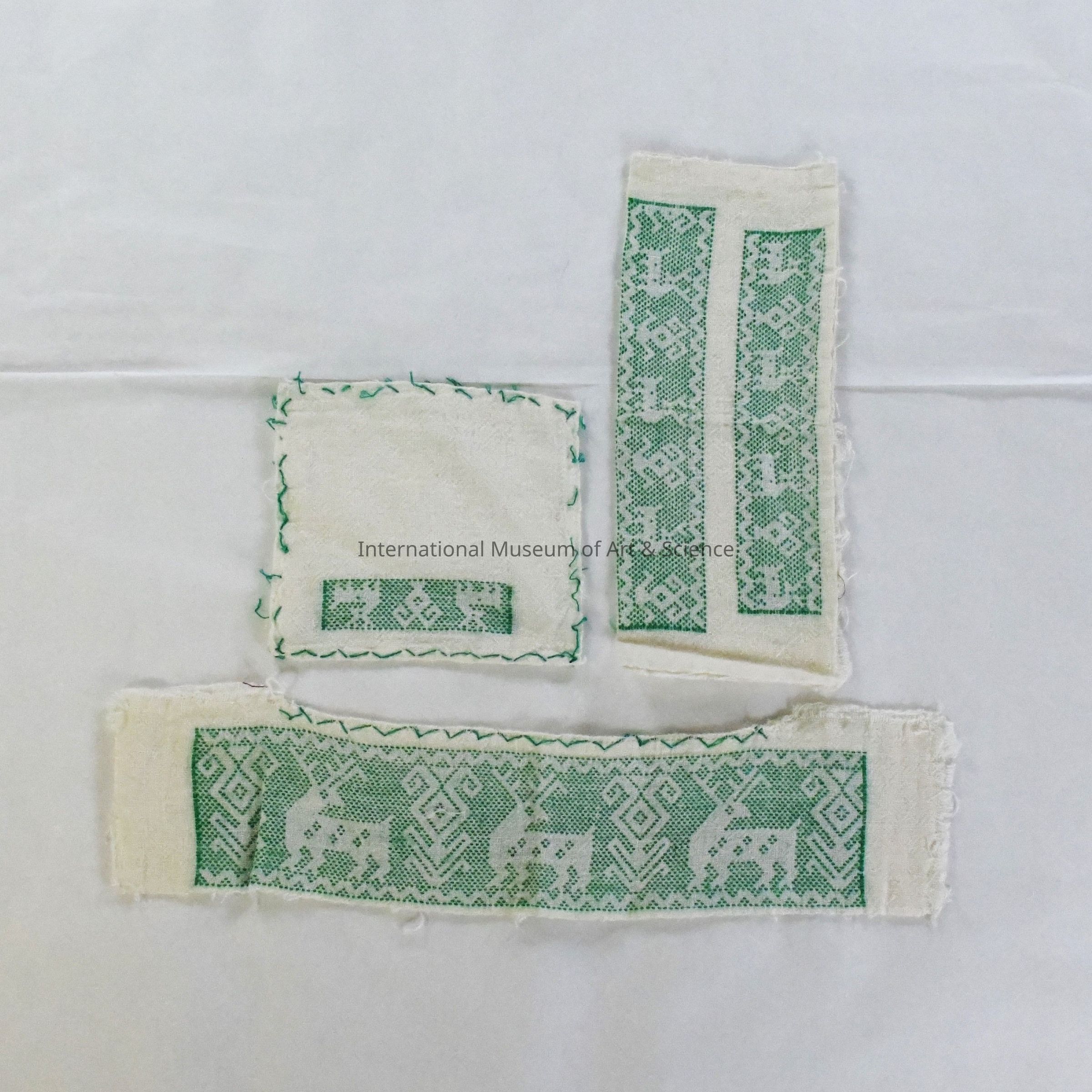 This set of three blouse components includes two rectangular panels and a square panel, each adorned with the characteristic counted-thread embroidery of Atla, Sierra de Puebla. The textile base is a loosely woven cotton muslin, with designs rendered in green cotton thread using a meticulous counted-stitch technique. The panels feature a repeated pattern of stylized deer flanked by geometric motifs. All three pieces are edged with a simple overcast stitch in green thread to prevent unraveling before final blouse assembly. These panels are sold unfinished, allowing local women to incorporate them into blouses according to individual fit and preference.Ethnography