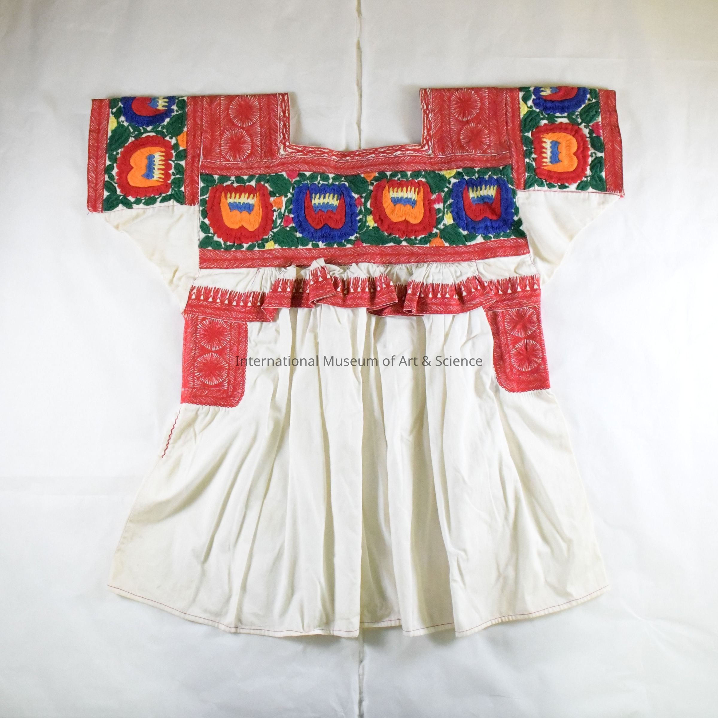 Drawn-on dibujo (drawing) embroidery technique in cotton thread on high quality poplin ground cloth; máquina (machine) treadle machine work on borders, yoke ruffle, and neckline, tailored and assembled on treadle machine. Note reinforced cotton with embroidery at neckline and double cloth at sleeve gusset.Ethnography