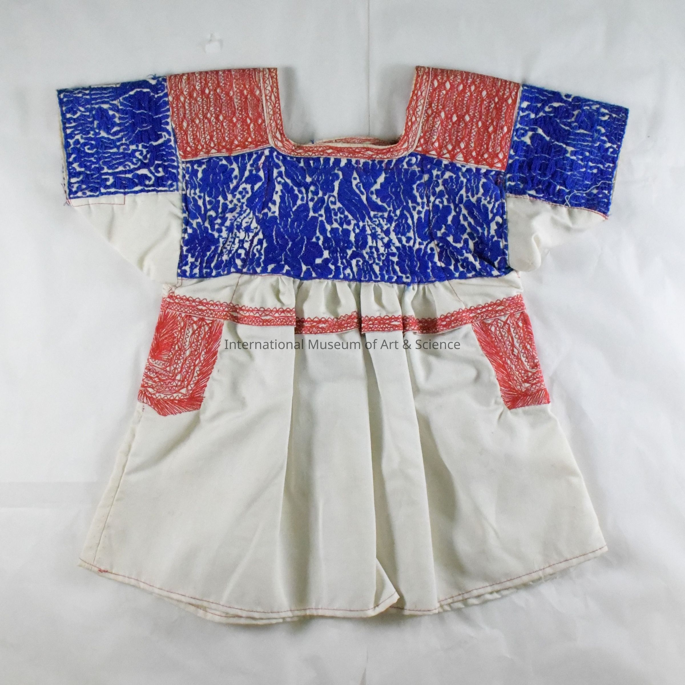 Girl's camisa (blouse), mostly worn during a fiesta as well as daily use. Cotton pepenado (counted thread) embroidery technique on high quality poplin. The embroidery technique is under-over, motion left to right, counting threads to execute each design; simple threadle machine work in red cotton thread.Ethnography