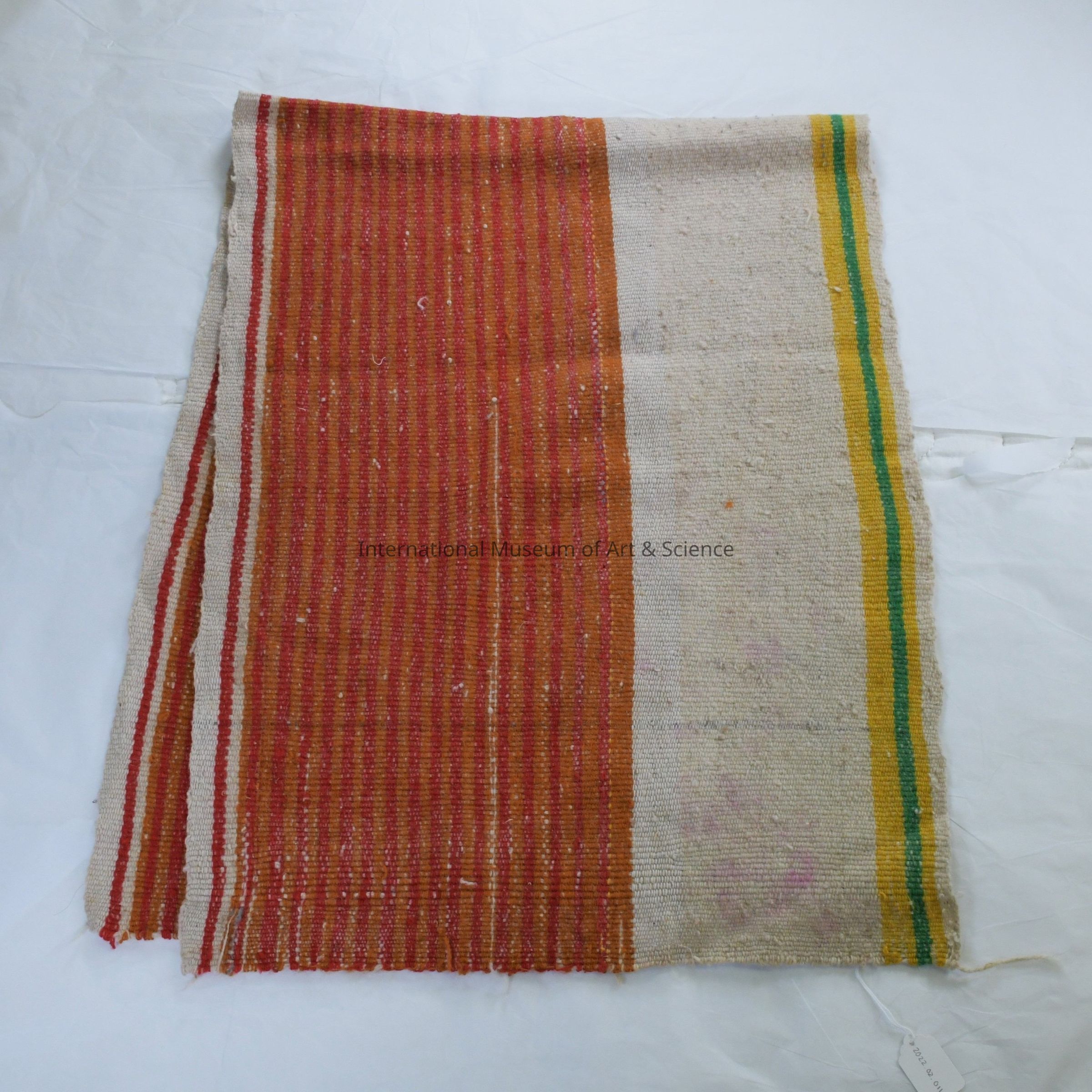 This small wrap-around skirt (falda) is woven from handspun natural white wool on a backstrap loom. It is constructed as a single panel (one lienzo) with four complete selvages, indicating the piece was finished on the loom without need for hemming. The ground weave is a plain weave structure with a soft, slightly uneven surface characteristic of handspun wool. The decorative stripes along the warp include commercial wool and cotton yarns in vibrant colors—primarily deep red, orange, yellow, and green—creating bold visual contrast against the cream background. Narrow bands of green and yellow mark the outer edge, while a wider central section features alternating red and orange warp stripes. Small, scattered traces of pink pigment appear faintly on the white wool portion, suggesting incidental staining or possible previous ritual use.Ethnography