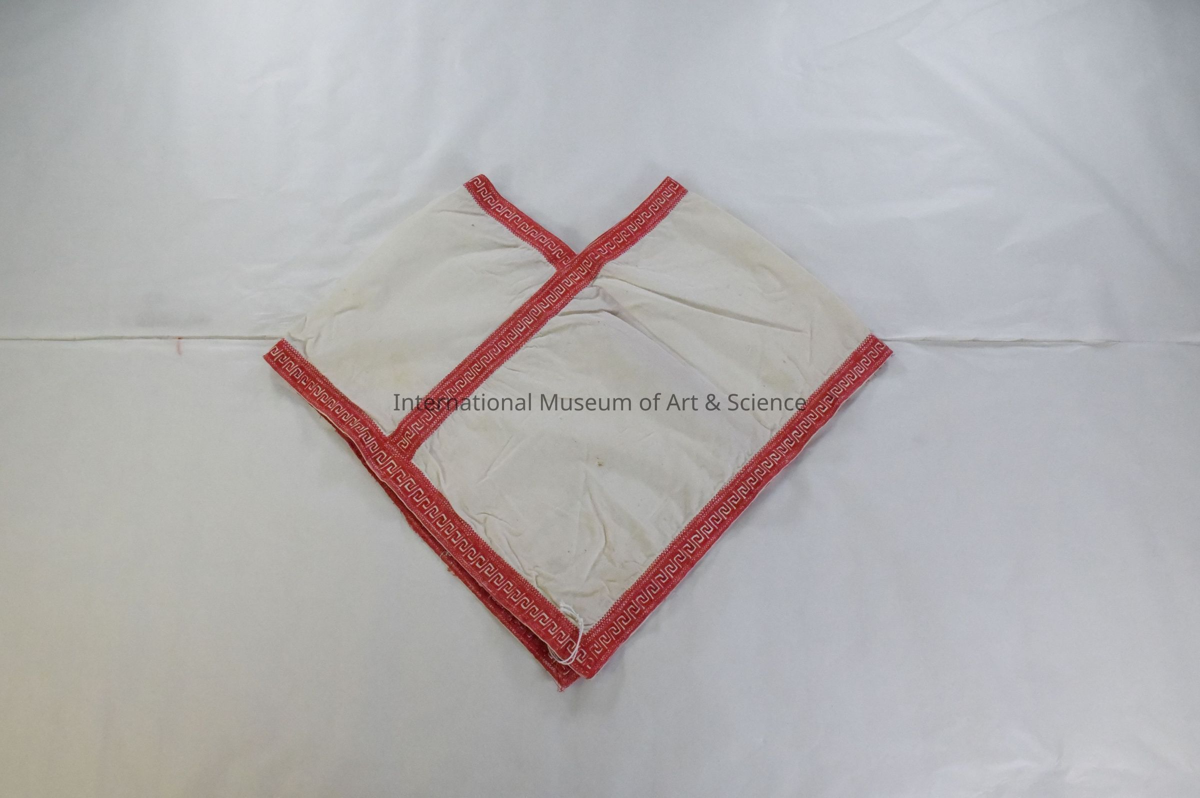 This quexquemitl consists of two joined white commercial muslin panels sewn together in a V-shape to form a shoulder-length garment. The panels are edged with vibrant red commercial lace trim featuring a geometric motif rendered in raised velvet-like flocking. The trim is applied along all open edges, including the neckline, which is squared and slightly open at the shoulder seam. The garment is lightweight and unlined, with plainly finished seams and modest gathering at the neckline.Ethnography